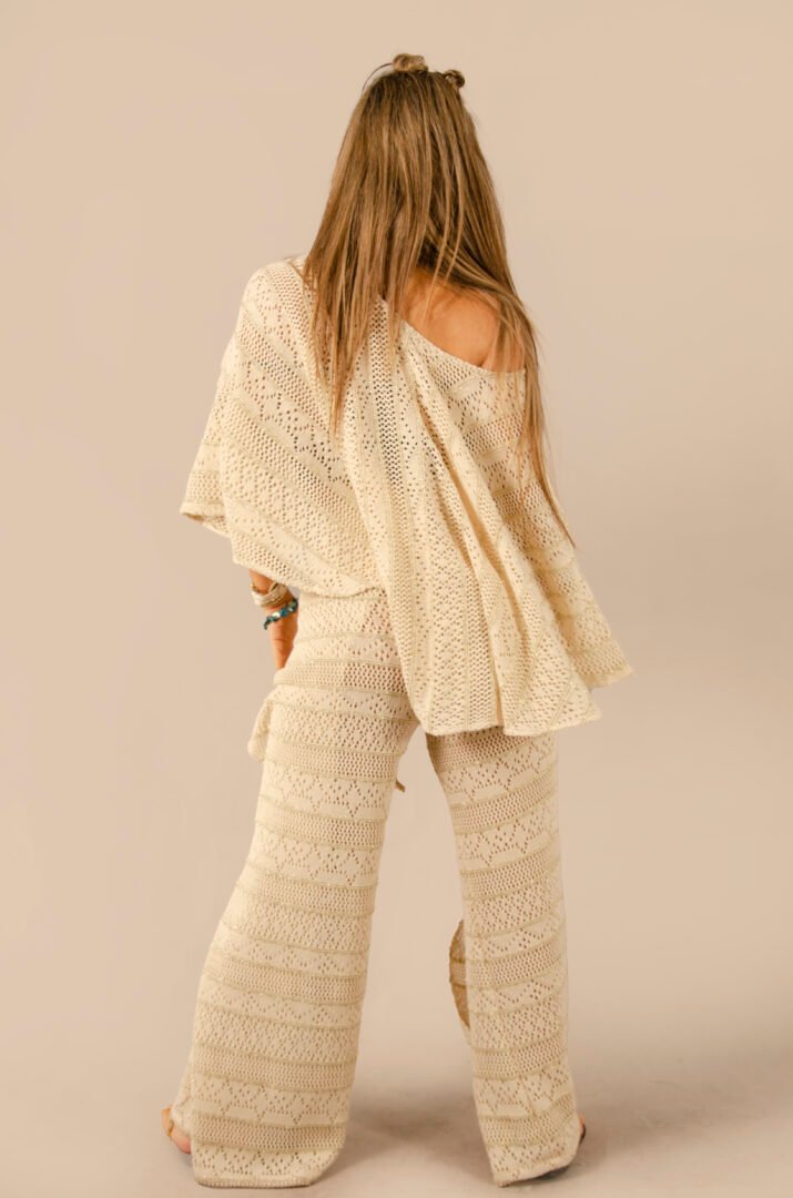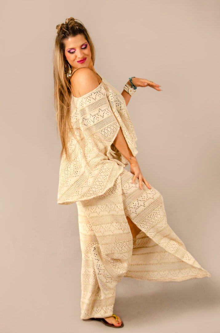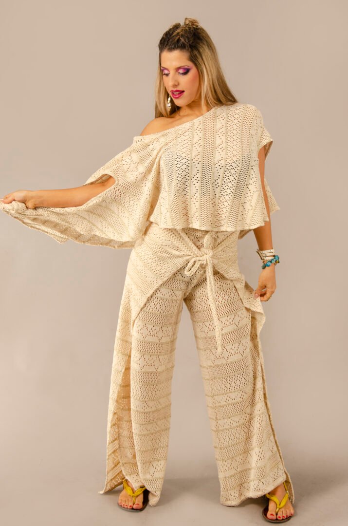 The pants feature an open-side design, allowing for a perfect fit at the waist thanks to its adjustable system, making it adaptable to any size. The top, true to Afrodit@’s classic spirit, offers a spectacular drape at the back and is shorter at the front, creating a perfect balance between comfort and style.