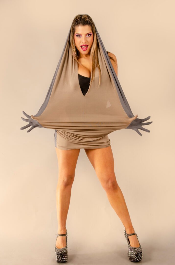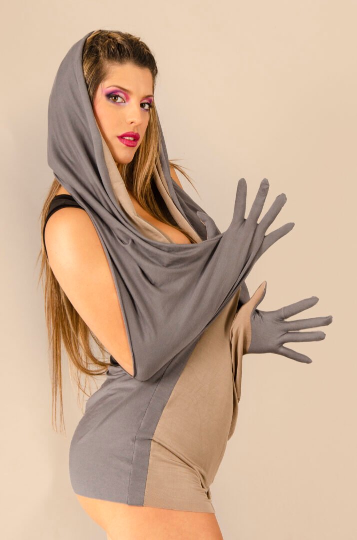 The garment features a completely open back and sleeves that transform into gloves, with a large front neckline and a hood that can be worn in different ways or not at all. The gloves can also be transformed into pockets, allowing the top to be worn as a tank top. This innovative design is exclusive to Afrodita.