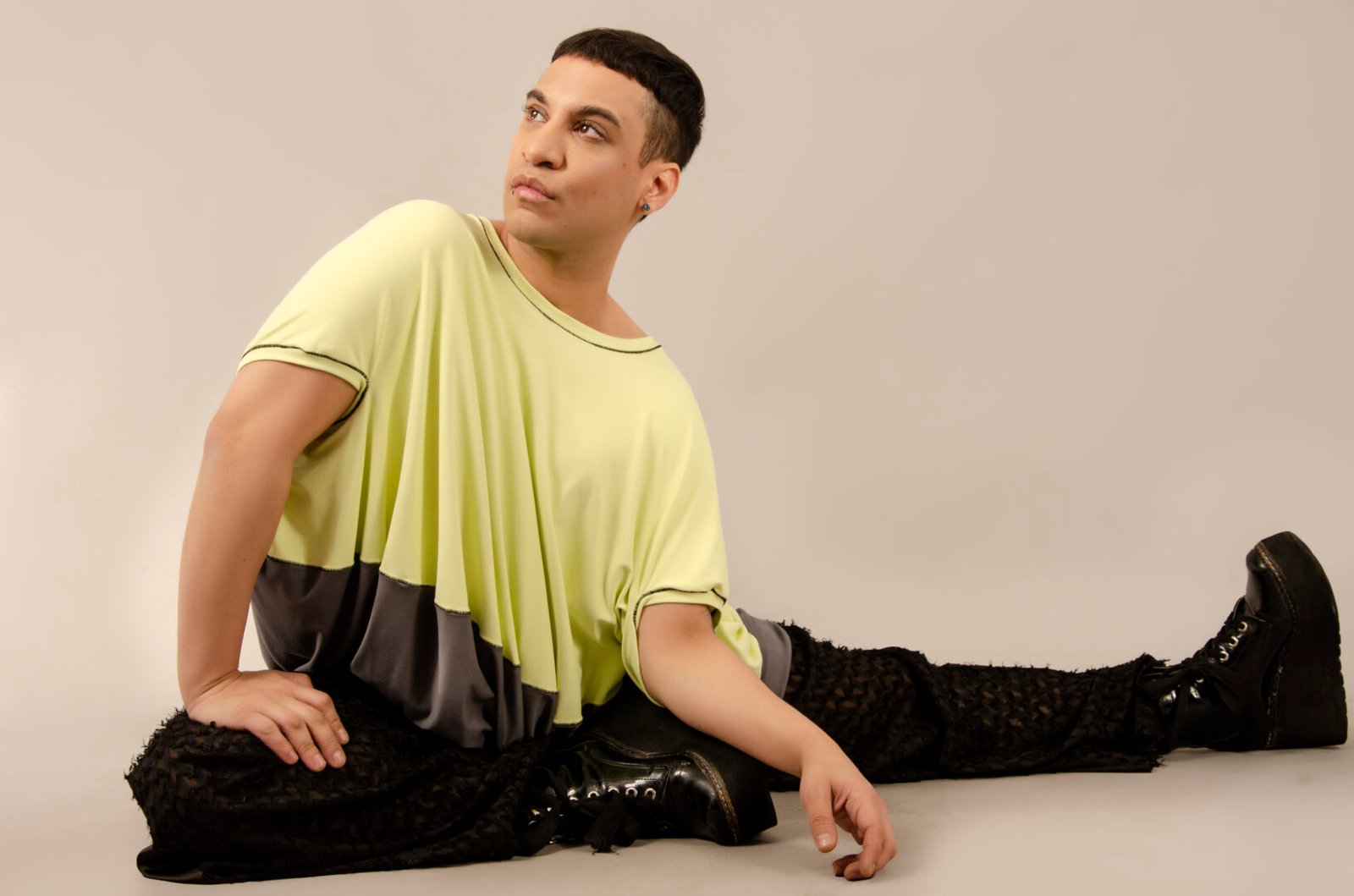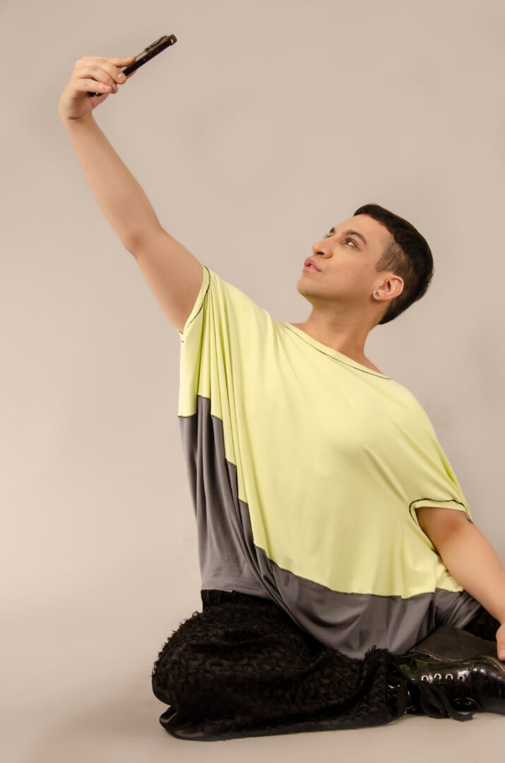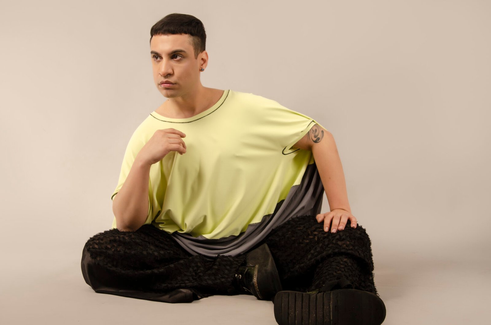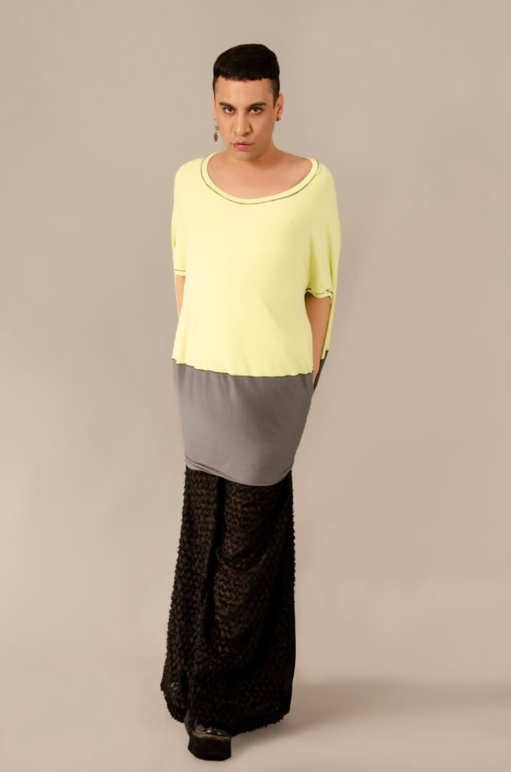 The garment is characterized by its wonderful drape, being shorter in the front and longer in the back, creating a parachute-like pouch effect. Made from Italian cotton lycra in two colors: lime green and gray, with embroidered details and decorative seams in black, giving it a more sporty look suitable for daytime, while maintaining its versatility.