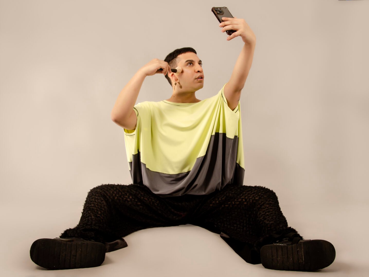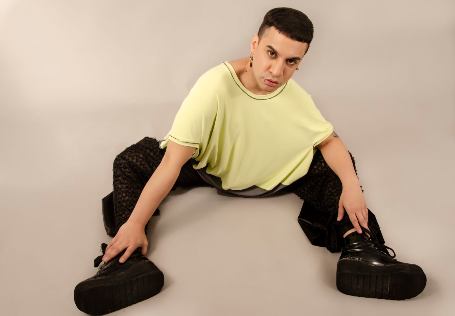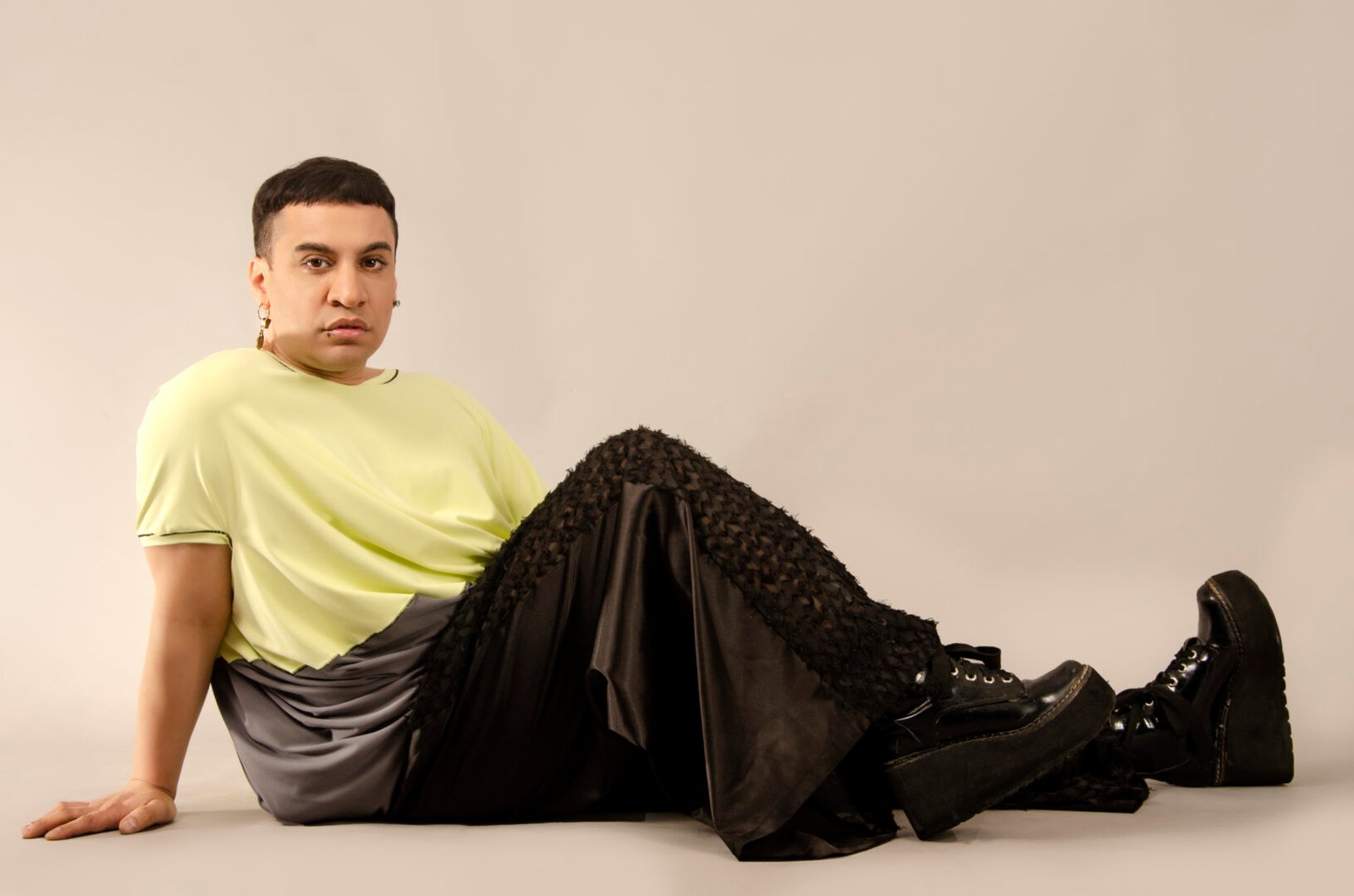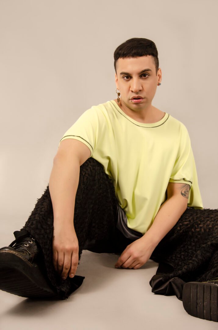 The garment is characterized by its wonderful drape, being shorter in the front and longer in the back, creating a parachute-like pouch effect. Made from Italian cotton lycra in two colors: lime green and gray, with embroidered details and decorative seams in black, giving it a more sporty look suitable for daytime, while maintaining its versatility.
