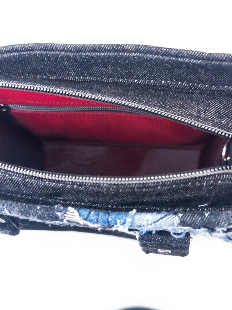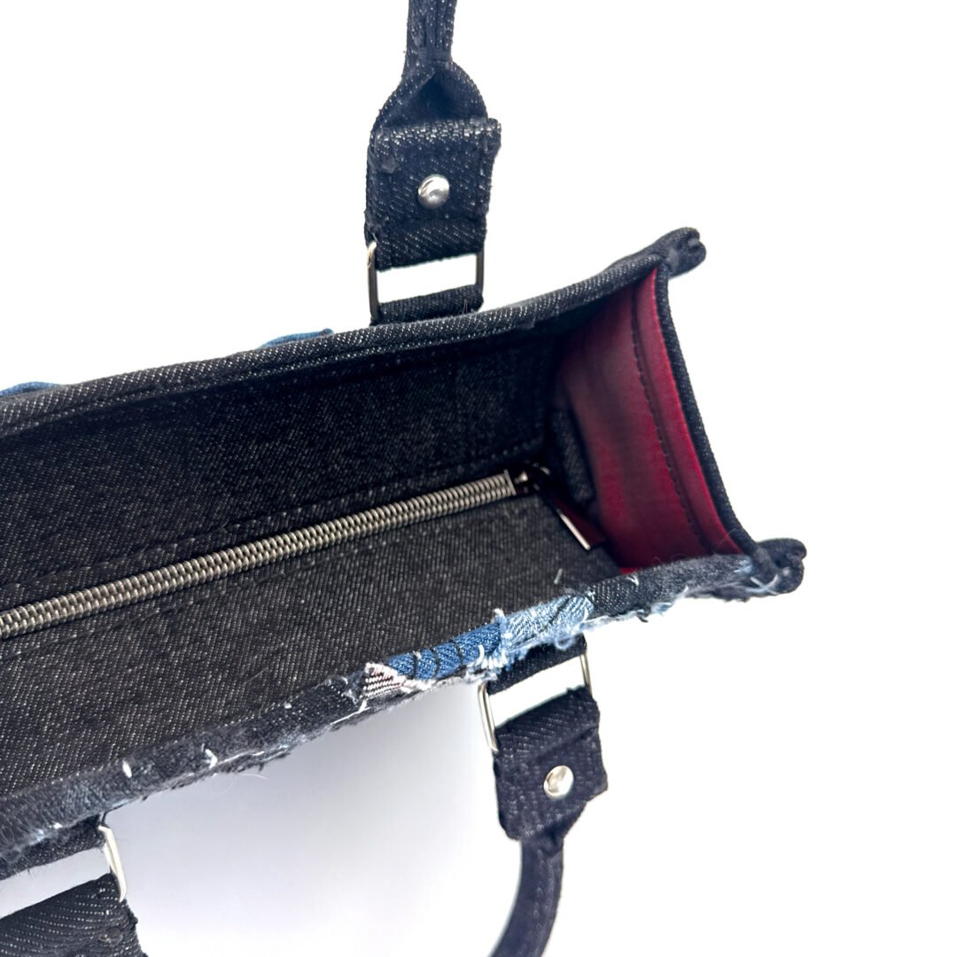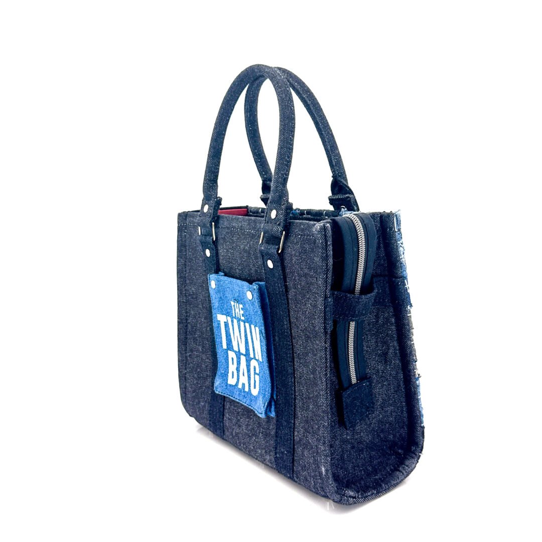 The Twin Bag Sky is an exclusive piece from our Nova Limited line at Afrodit@, designed for those seeking a unique and sustainable accessory, meant to be shared between two special people. This set of bags is truly “one of a kind,” as there are only two sets in the entire world. Crafted 100% by hand, they use recycled Denim in various shades of blue, gray, and black, with black details and metallic accents. Each bag features a silver-colored metal zipper.