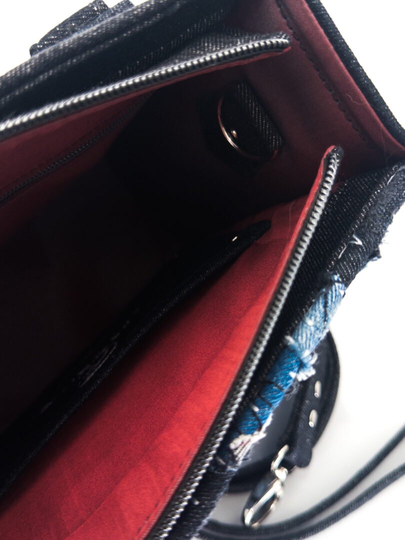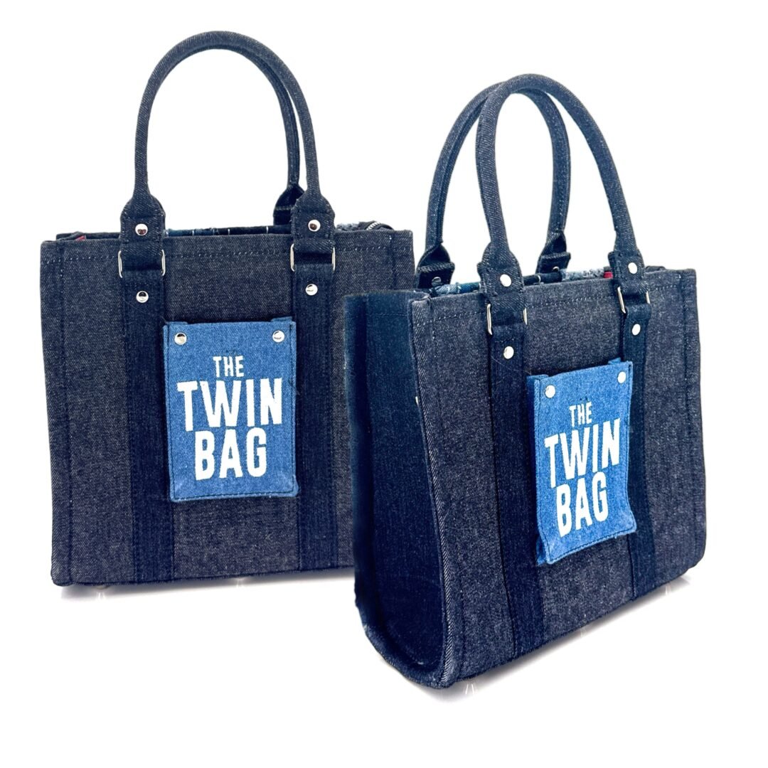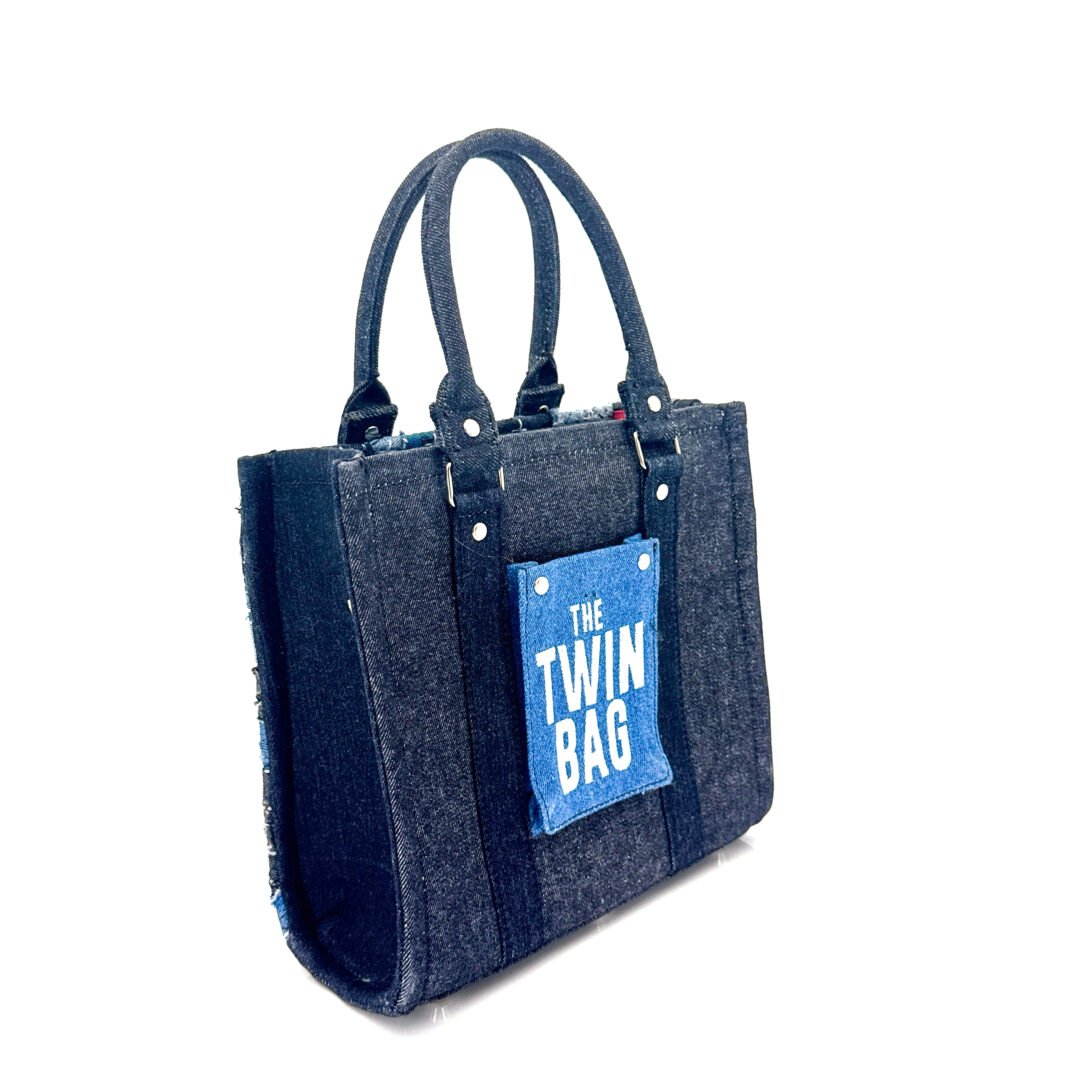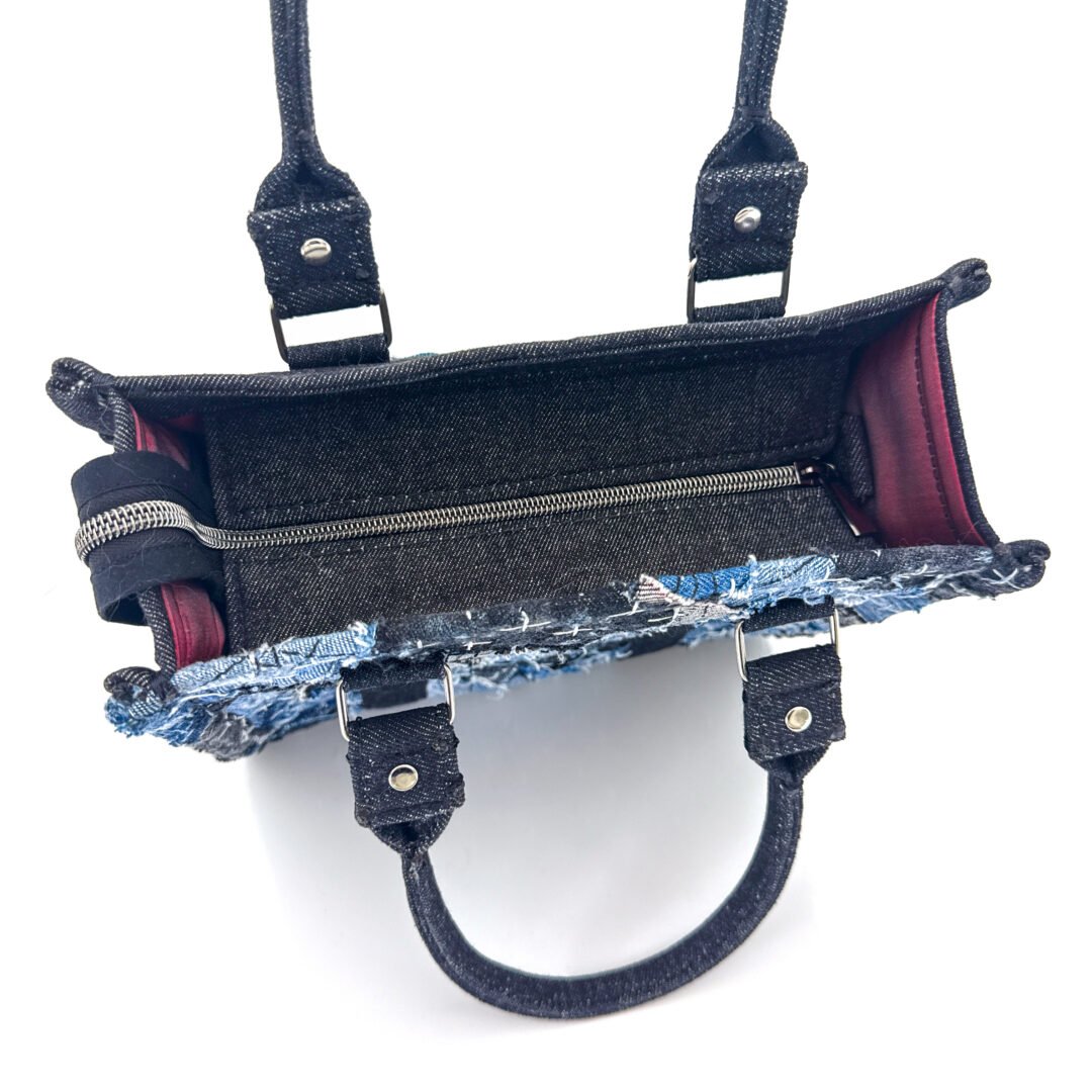 The Twin Bag Sky is an exclusive piece from our Nova Limited line at Afrodit@, designed for those seeking a unique and sustainable accessory, meant to be shared between two special people. This set of bags is truly “one of a kind,” as there are only two sets in the entire world. Crafted 100% by hand, they use recycled Denim in various shades of blue, gray, and black, with black details and metallic accents. Each bag features a silver-colored metal zipper.