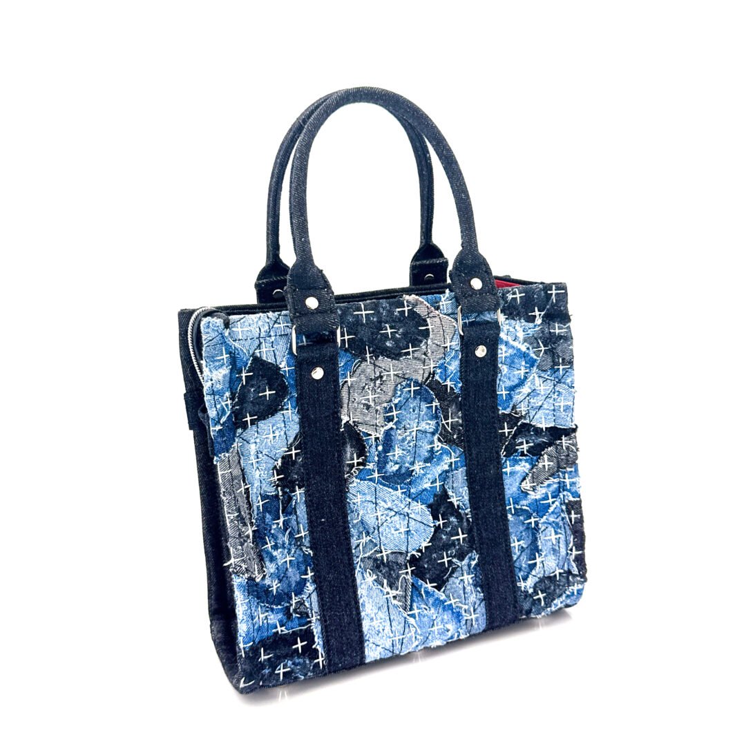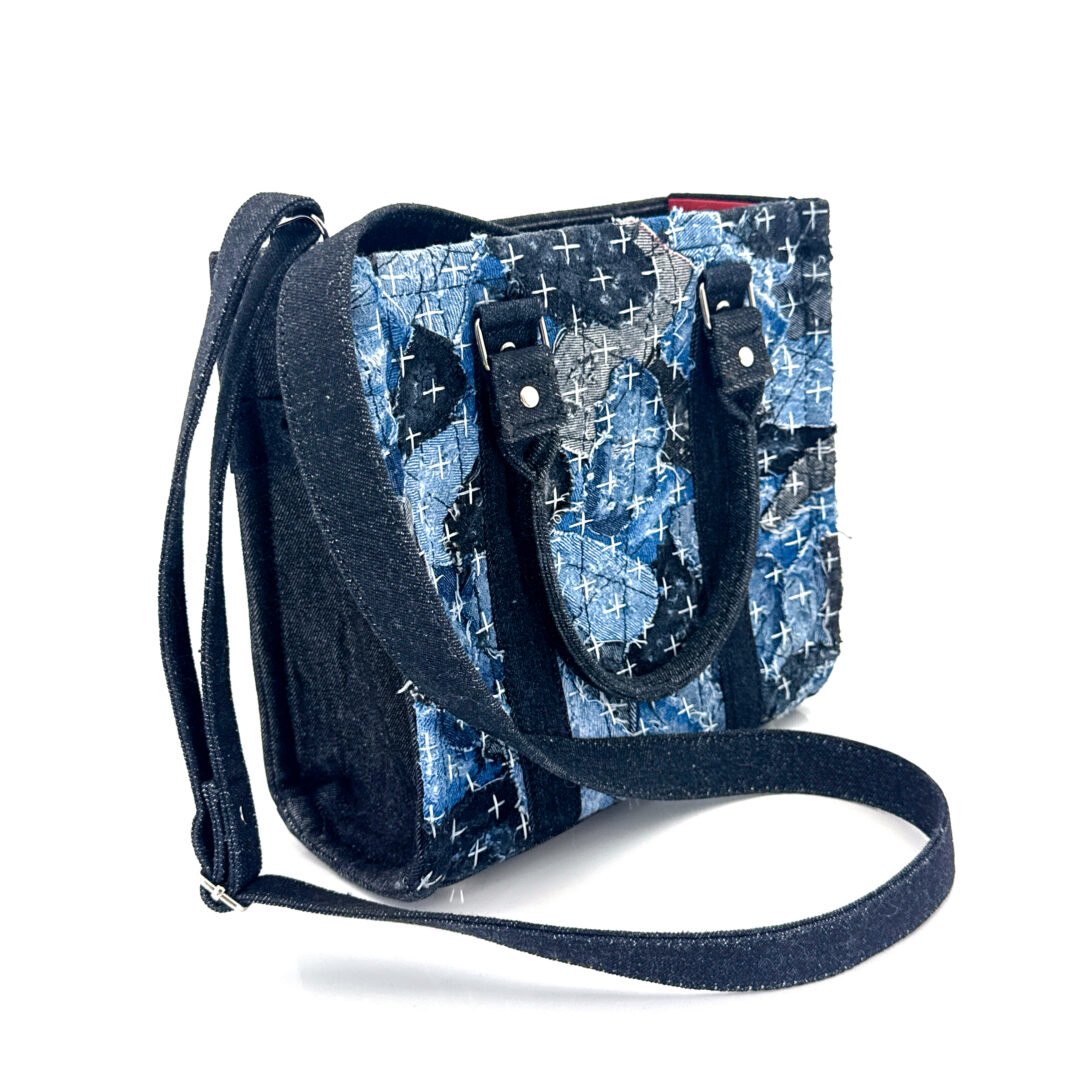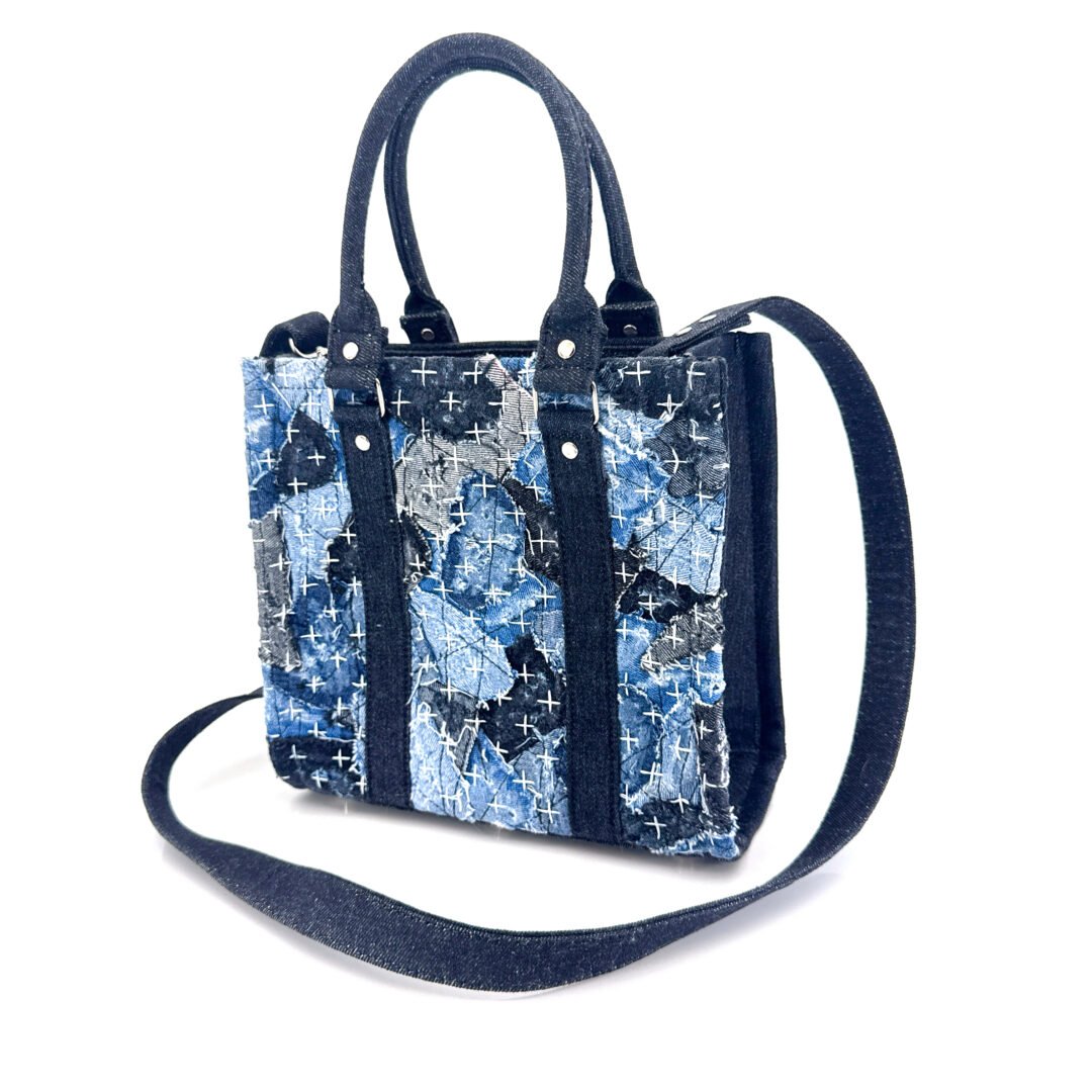 • Material: Recycled Denim in shades of blue, gray, and black