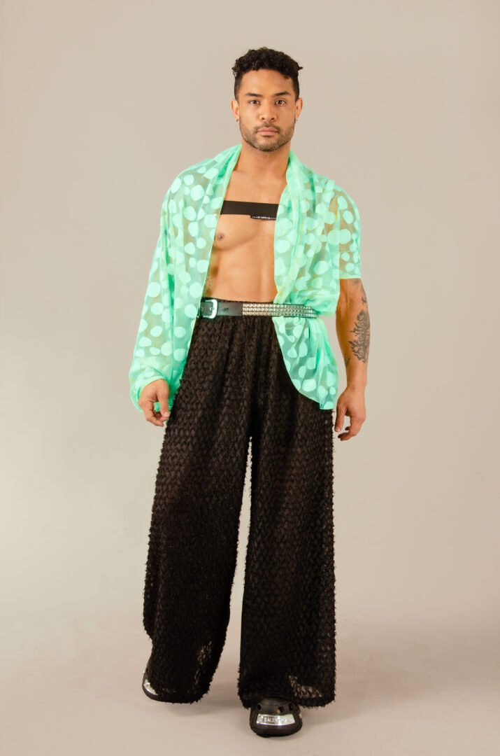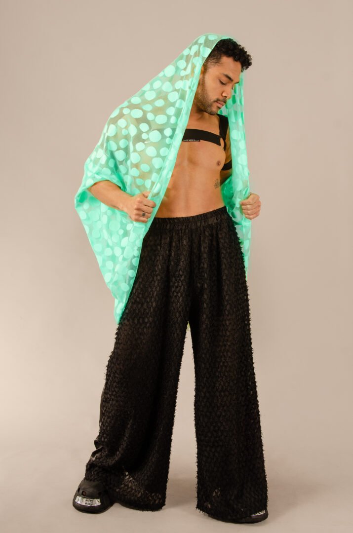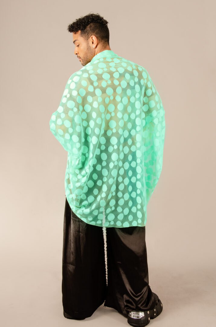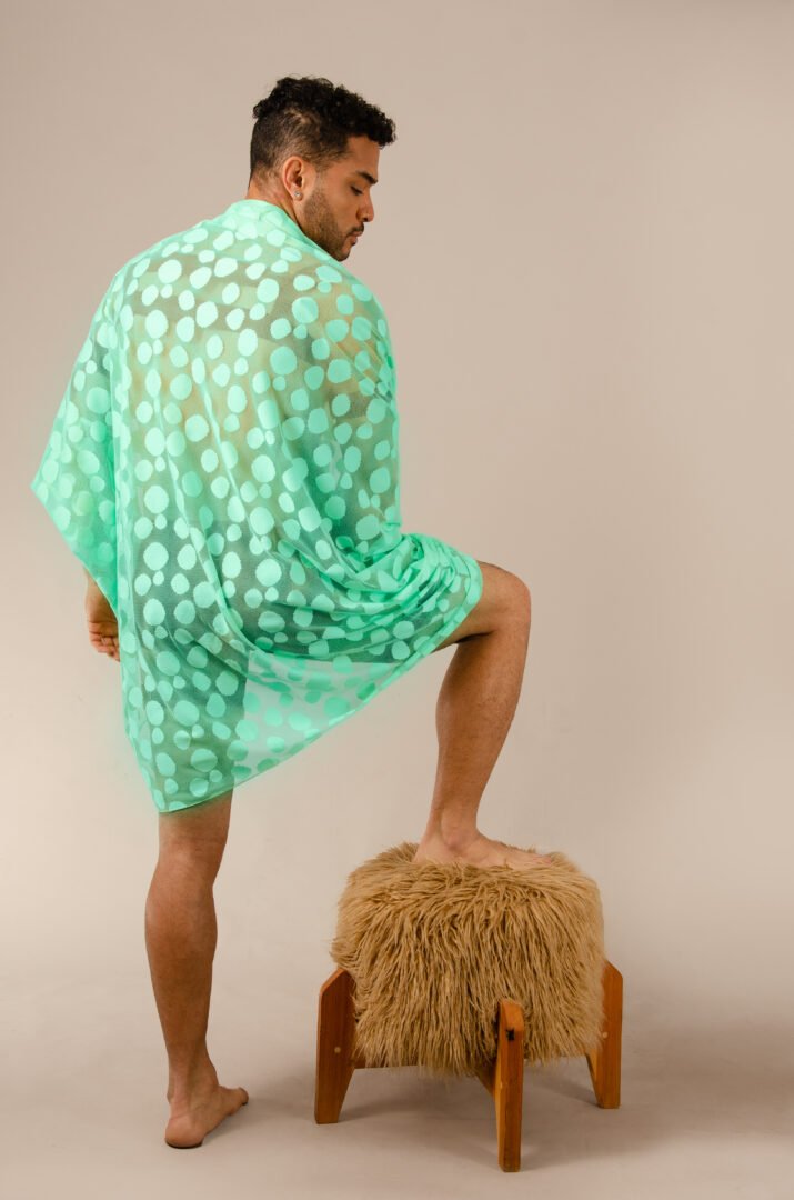 The Tunique Desierto in aqua green is crafted from intricately worked lace with a circular design, a high-quality textile made in Italy. The piece is entirely crafted in France, adhering to the highest standards of craftsmanship. This transformable design allows you to play with the sleeves, which can be worn long or gathered to resemble short sleeves. Additionally, you can add a belt to transform it into a shirt. It is perfect for wearing at the beach or at a party with a nice pair of pants, allowing everyone to choose how they want to wear it.