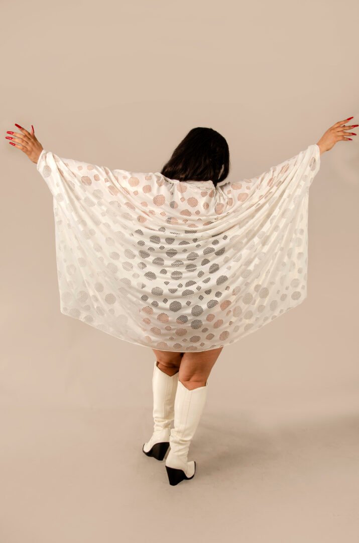 The Tunique Desierto in white is an exclusive creation from our Afrodita store. It features white lace with circular cutouts, interwoven with golden Lurex threads that give it a stunning shine in the light. This fabric has been specially designed in Italy for Afrodita, making this piece a unique and exclusive edition. Entirely crafted in France, it adheres to the highest standards of craftsmanship. Its versatile design allows you to adjust the sleeves, wearing them long or gathered to resemble short sleeves. Additionally, you can add a belt to transform it into a shirt. Perfect for the beach or a party, paired with a nice pair of pants, it offers the freedom to choose how to wear it.