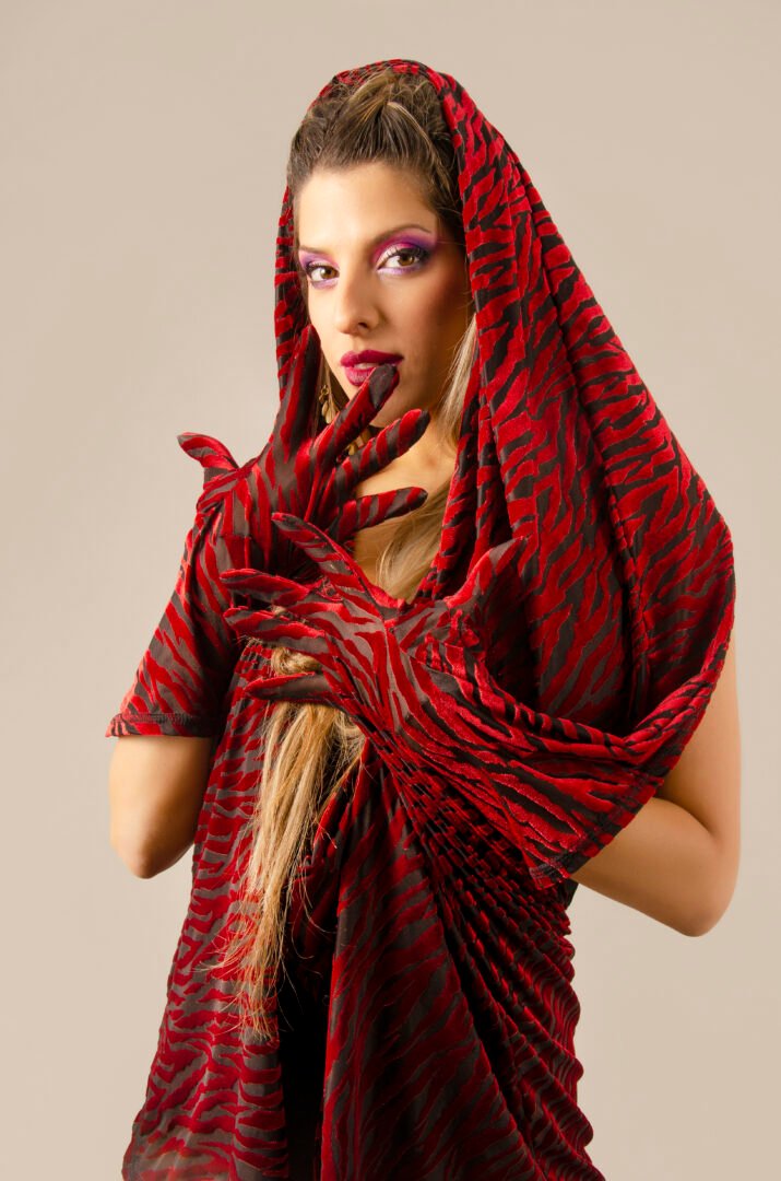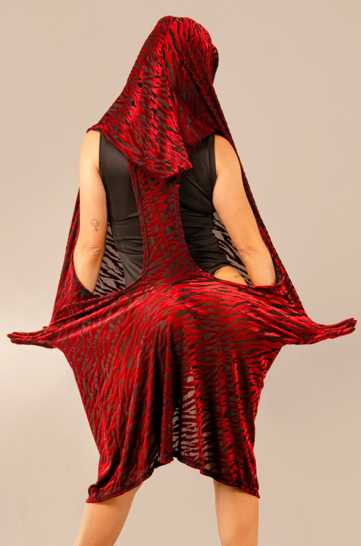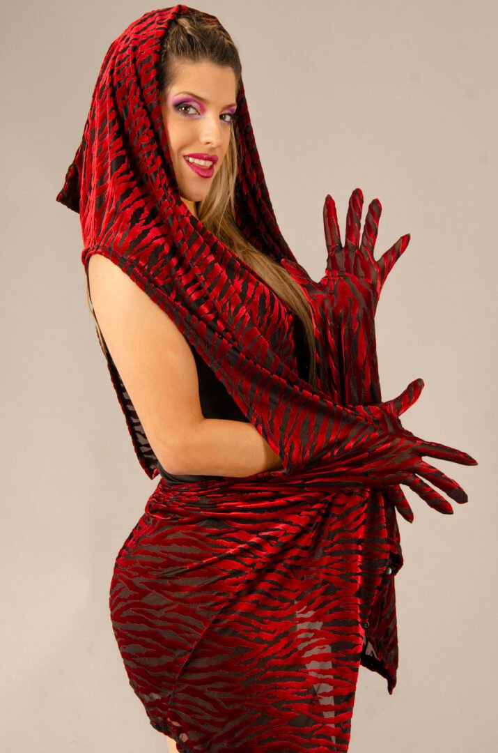 The TUNIQUE ENYGM@ is an exclusive piece from our Afrodita collection, designed for those who seek the extraordinary. This unique design features a front that can be worn closed or open with snap buttons, and a completely open back, offering an absolutely novel and mysterious style. Made from an exclusive red tiger-stripe velvet fabric over a black lycra tulle base, the material is stretchy and features transparencies that create an impressive visual effect. This fabric, made in Italy, is a super limited edition, ensuring its exclusivity.