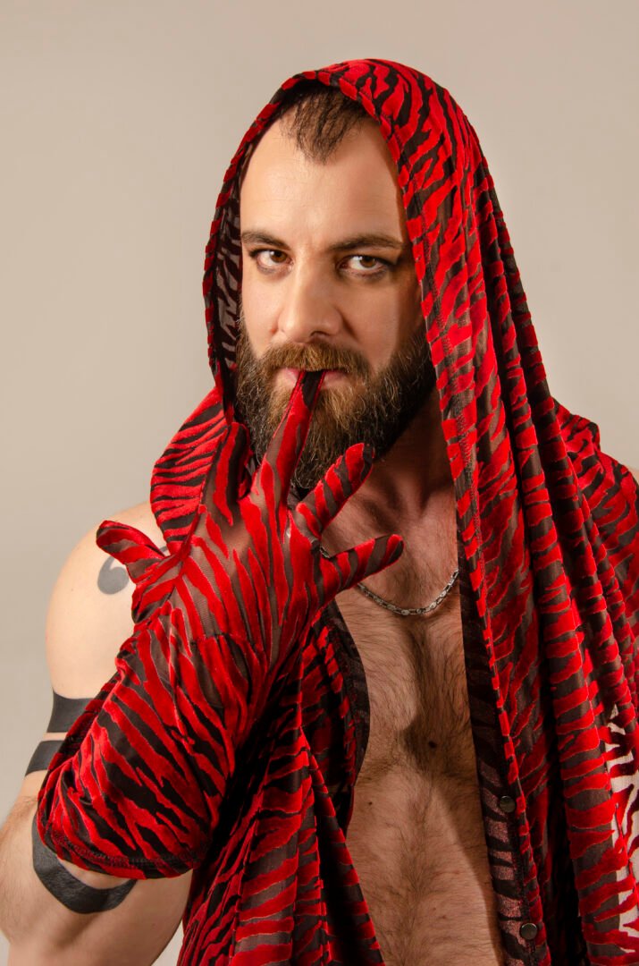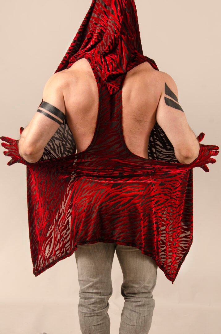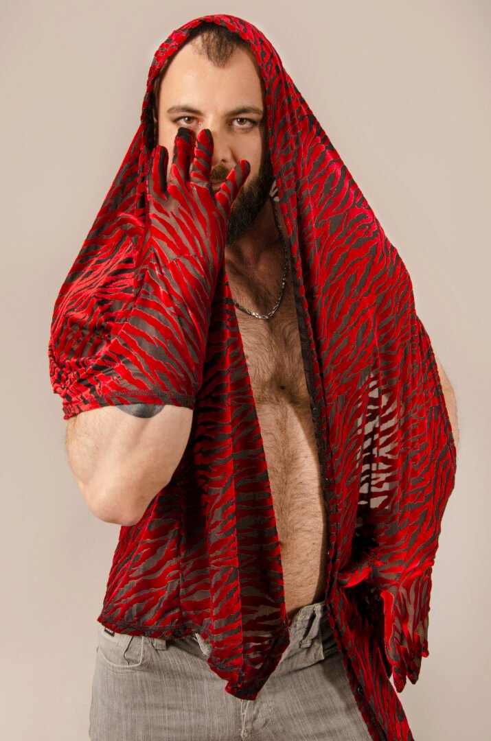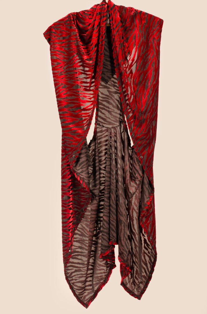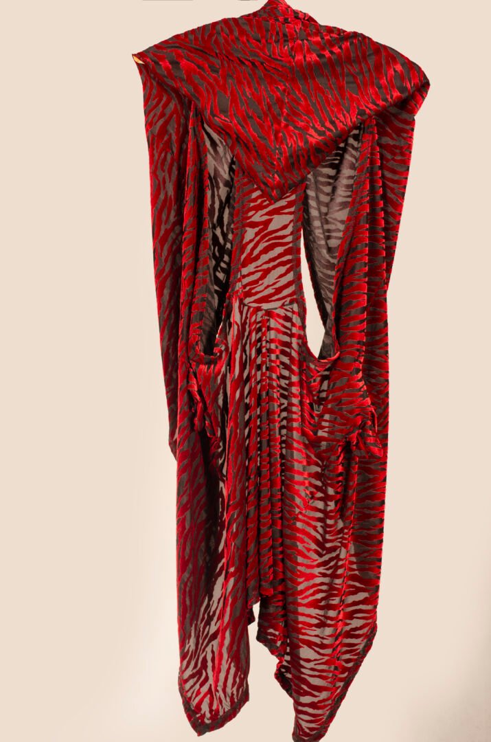 The TUNIQUE ENYGM@ is an exclusive piece from our Afrodita collection, designed for those who seek the extraordinary. This unique design features a front that can be worn closed or open with snap buttons, and a completely open back, offering an absolutely novel and mysterious style. Made from an exclusive red tiger-stripe velvet fabric over a black lycra tulle base, the material is stretchy and features transparencies that create an impressive visual effect. This fabric, made in Italy, is a super limited edition, ensuring its exclusivity.