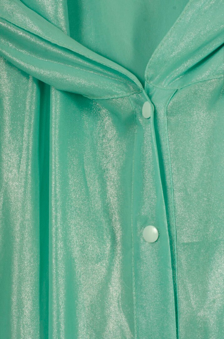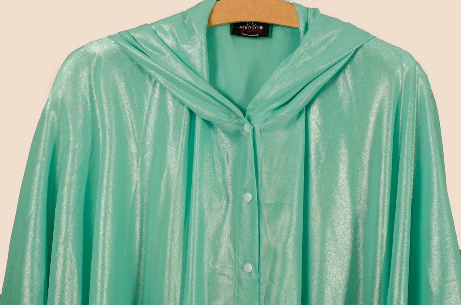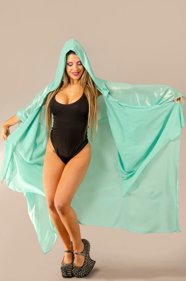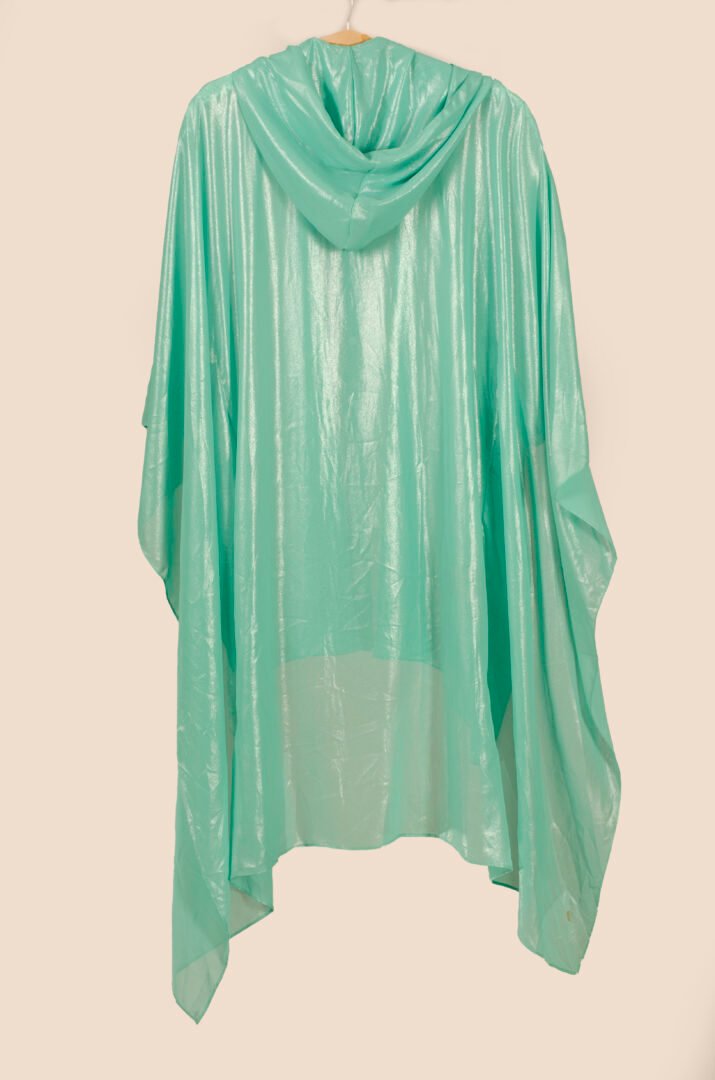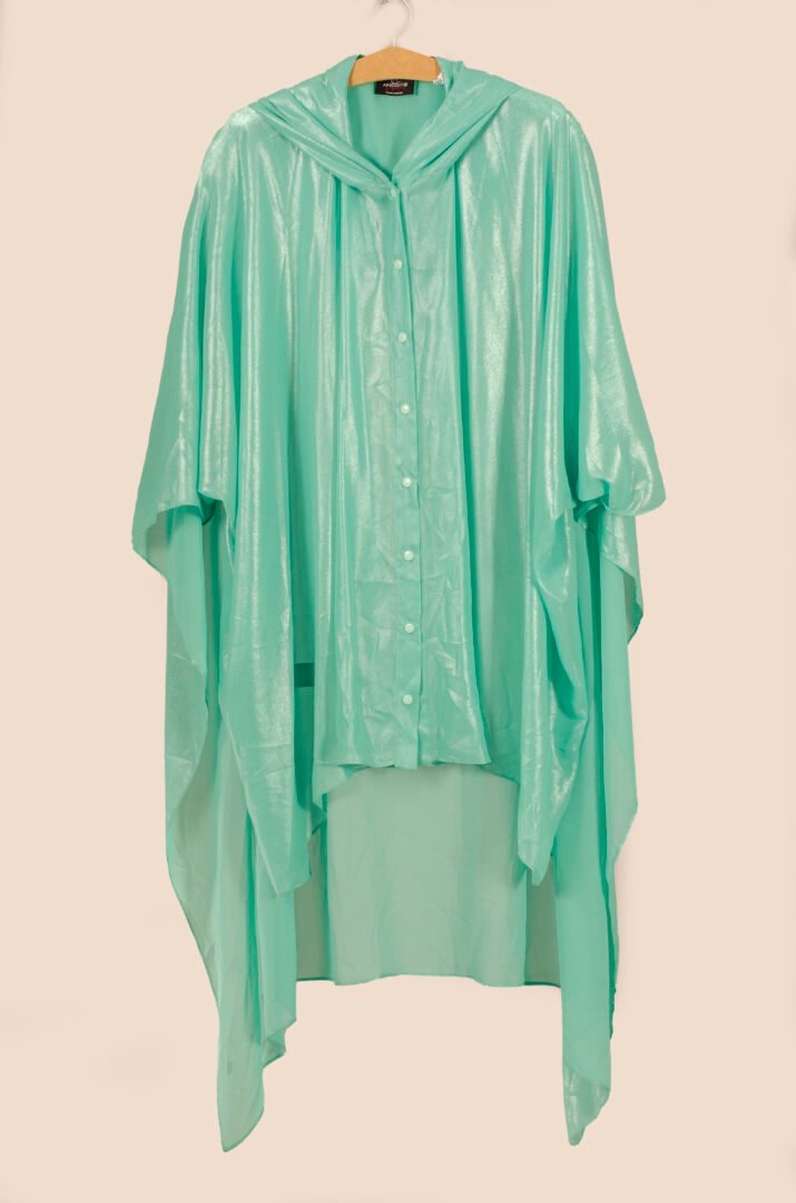 The TUNIQUE FATAL is an innovative piece from our Afrodita collection. This unique design combines the appearance of a shirt at the front with a cape at the back, offering an absolutely novel and diverse style. Made from synthetic silk 100% polyester, the fabric has exceptional drape and movement, providing freshness and elegance. The garment features a large oversize hood and tone-on-tone snap buttons. Its aqua green color, interwoven with silver threads, reflects a silver sheen in the light, creating an impressive visual effect. The versatility of the TUNIQUE FATAL allows it to be worn as an open tunic, a closed camisole, or with a belt to transform it into a dress. It is a wonderful piece that moves gracefully thanks to the quality of the fabric.