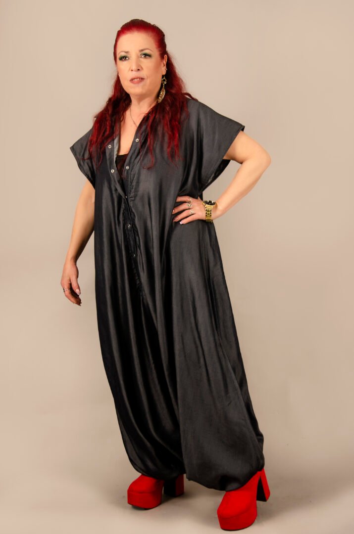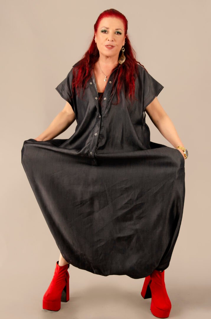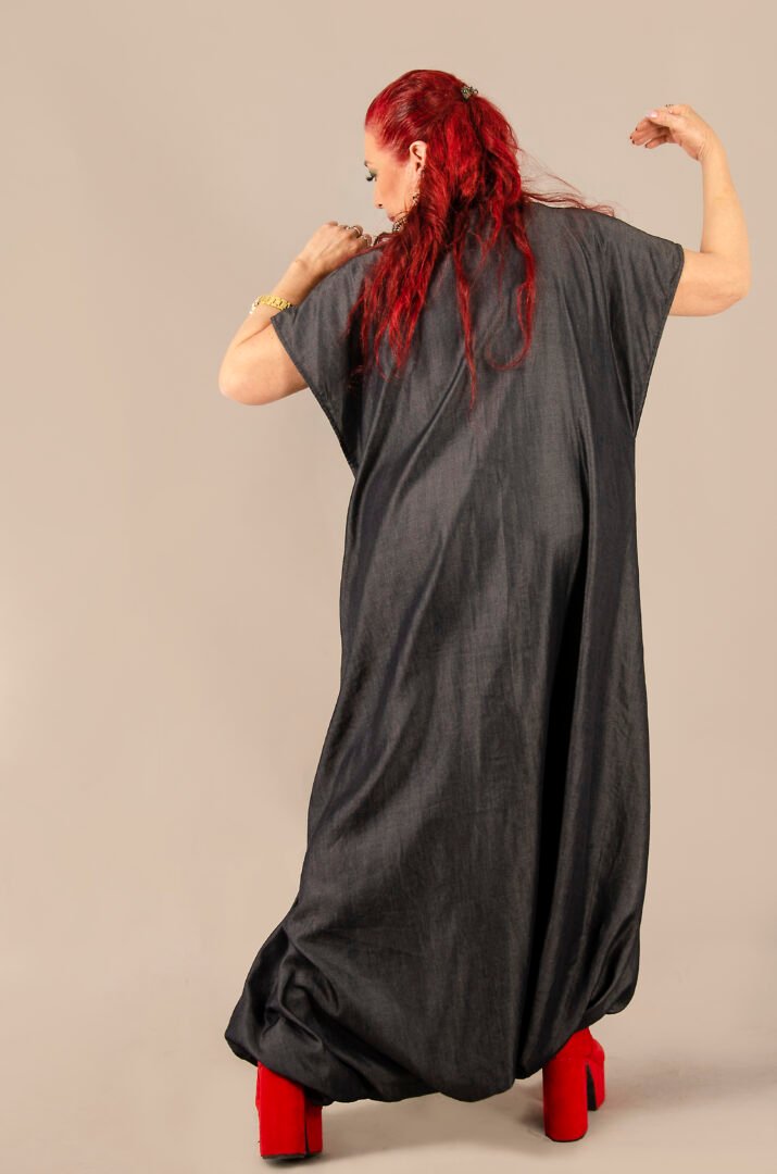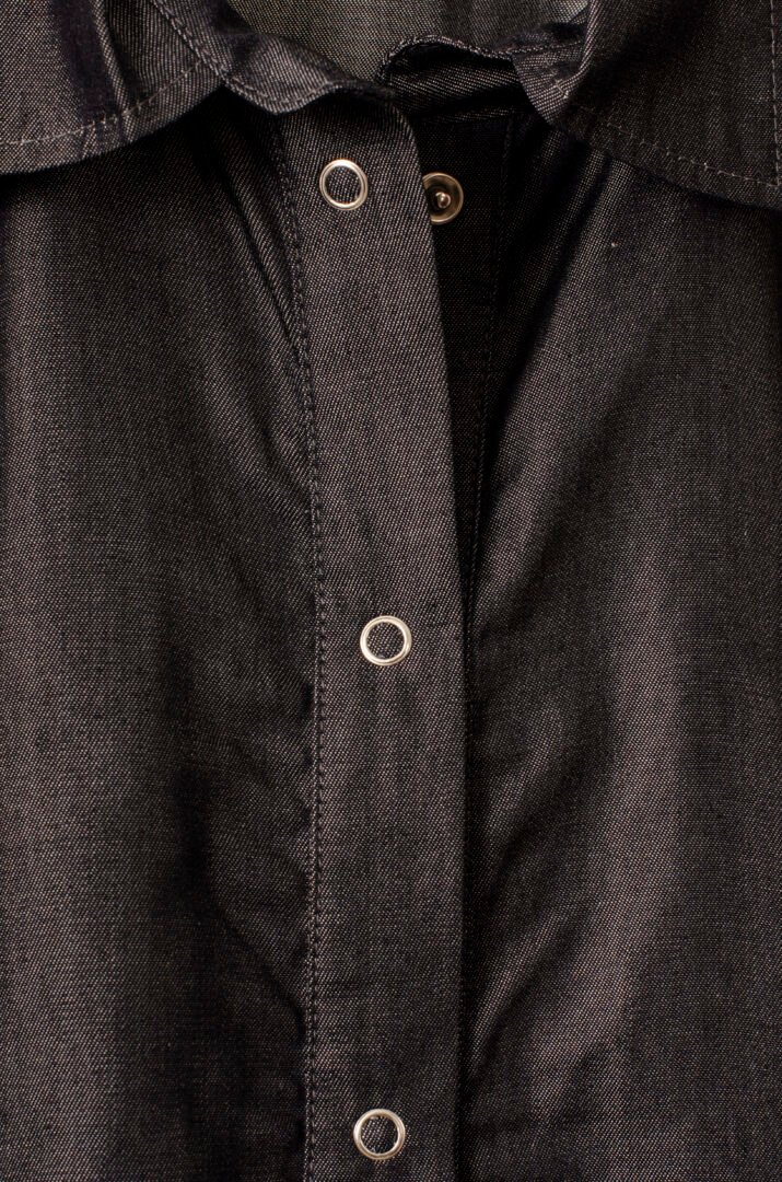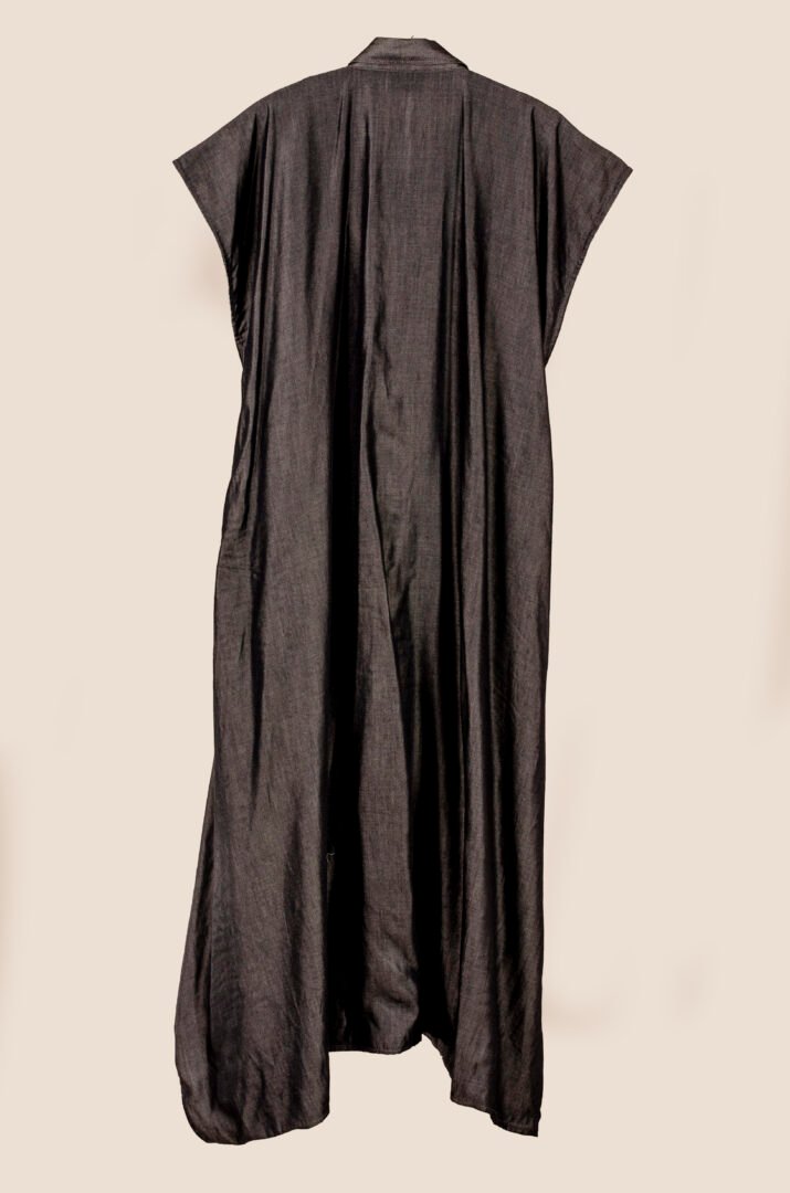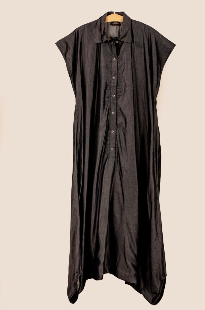 Crafted from a cutting-edge material called Tens, which mimics the feel of denim but with the drape of silk, this textile is made in Italy. The piece is then entirely crafted in France. It features a shirt collar, metal snap buttons, and invisible side pockets for enhanced functionality. A matching belt completes the ensemble, allowing for an elegant and comfortable transformation to suit all body types and occasions.