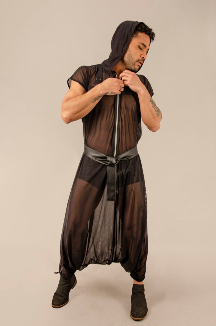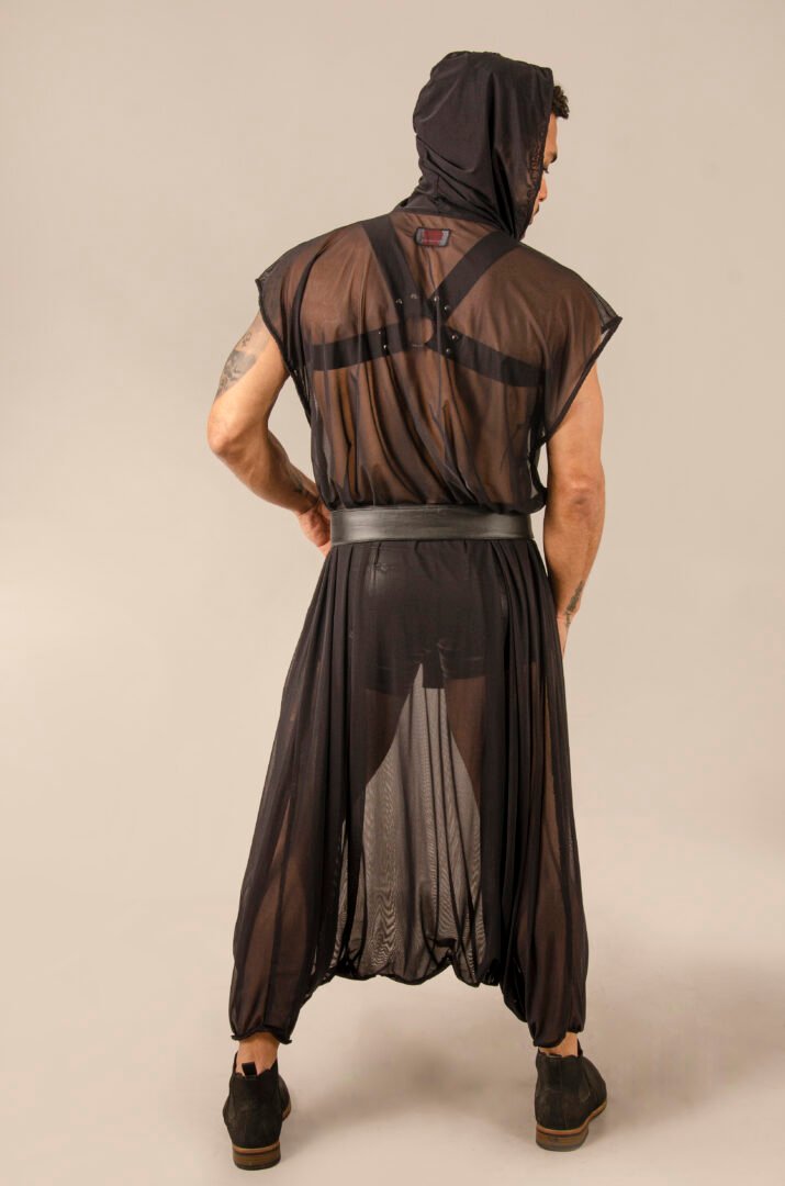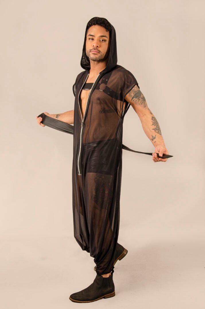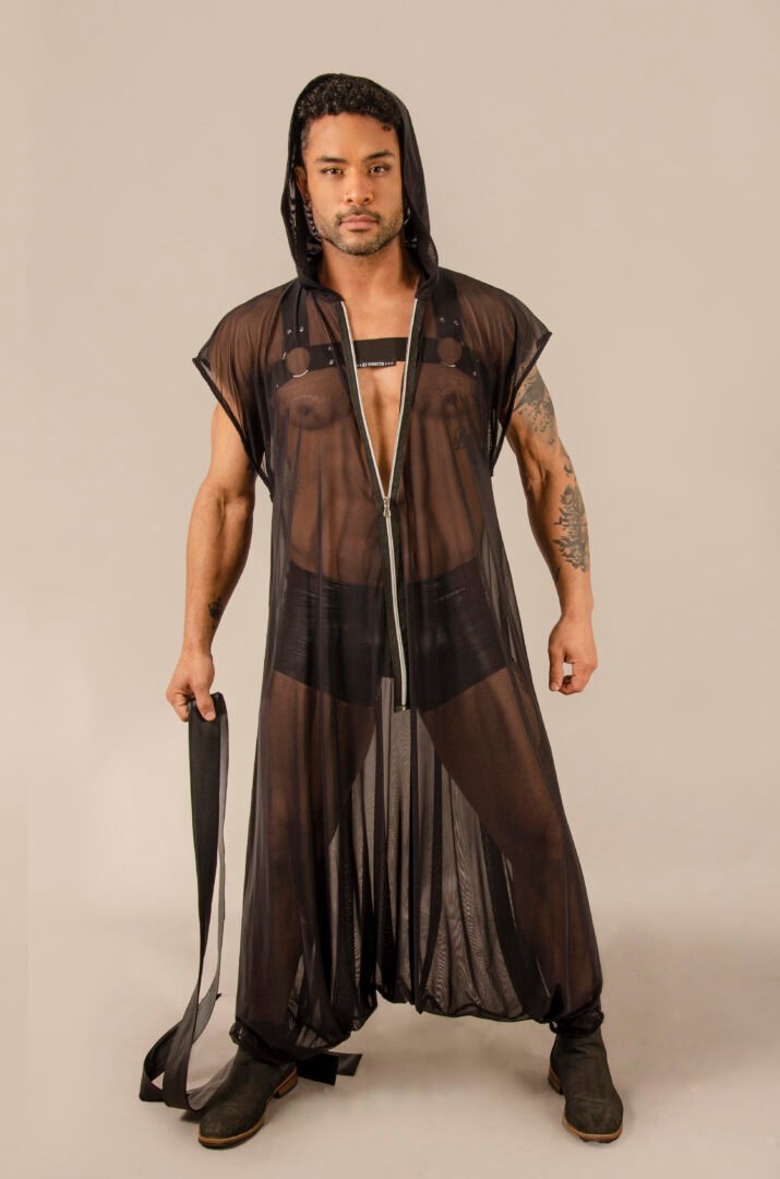 Crafted from Italian-origin lycra tulle, this exceptional gender-neutral piece features an oversized hood, a stylish visible closure, and a matching belt for enhanced functionality. Its transparent fabric adds a very sexy touch, while its unisex design and unique size allow for an elegant and comfortable adaptation to all body types and occasions. Made in France, it embodies high-quality handmade craftsmanship, inspired by French Haute Couture, applied to ready-to-wear fashion.