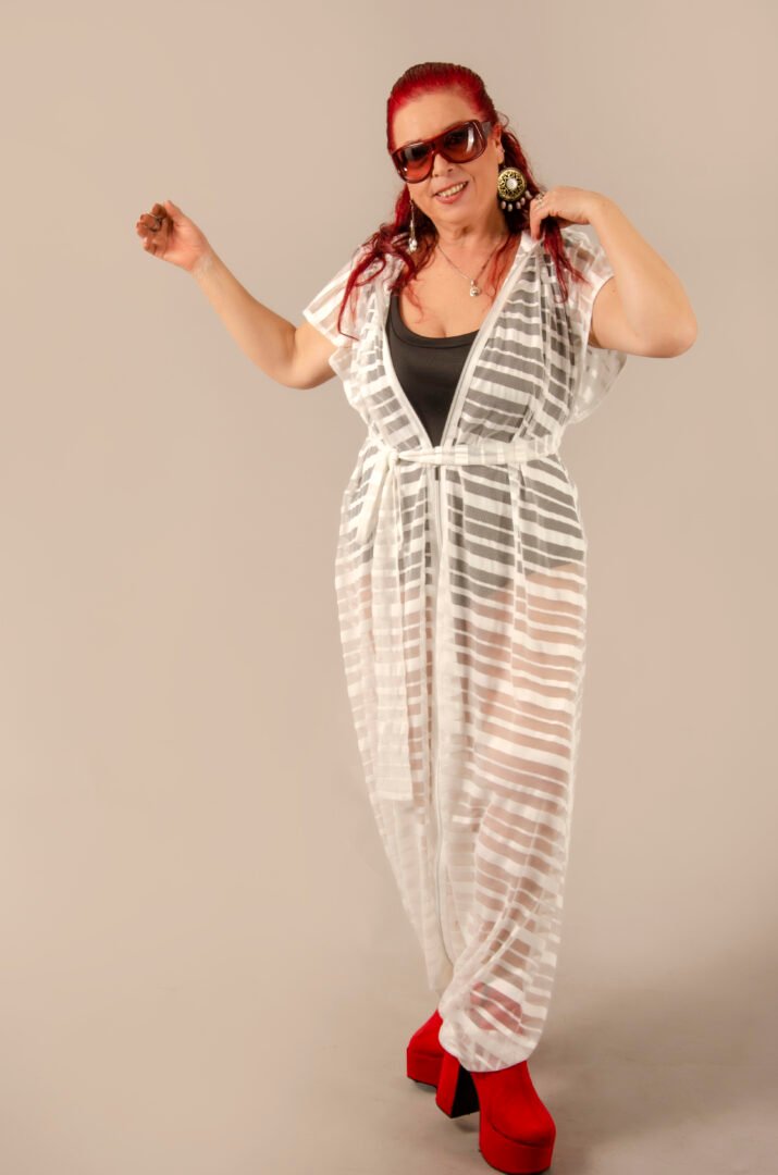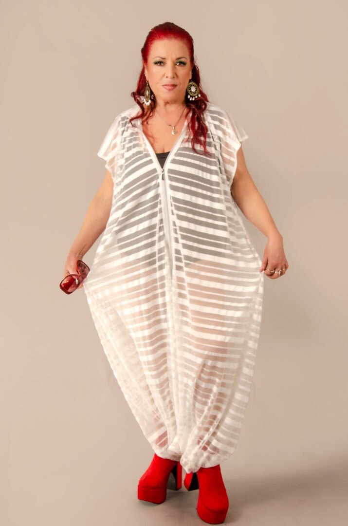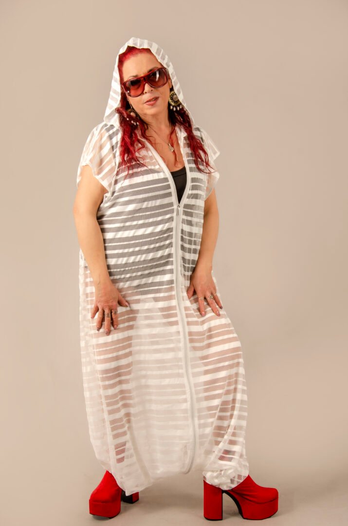 Crafted from Italian-origin white striped lace, this exceptional gender-neutral piece features an oversized hood, a stylish visible closure, and a matching belt for enhanced functionality. Its transparent fabric adds a very sexy touch, while its unisex design and unique size allow for an elegant and comfortable adaptation to all body types and occasions. Made in France, it embodies high-quality handmade craftsmanship, inspired by French Haute Couture, applied to ready-to-wear fashion.