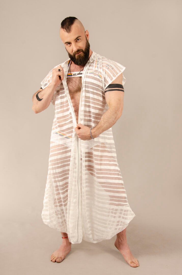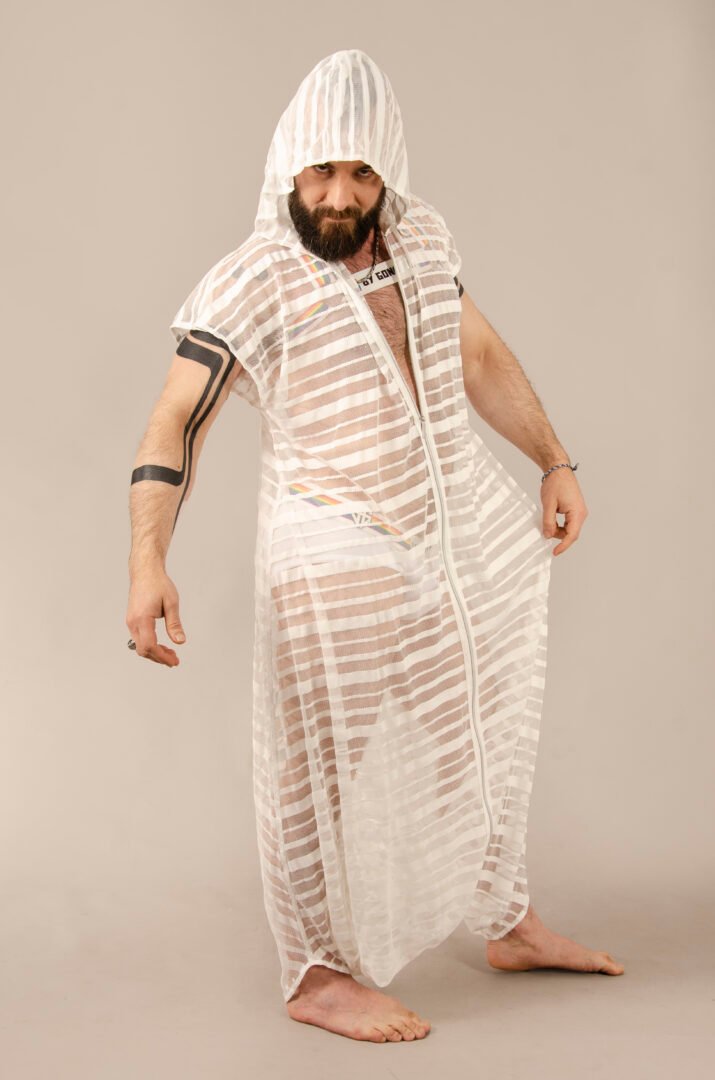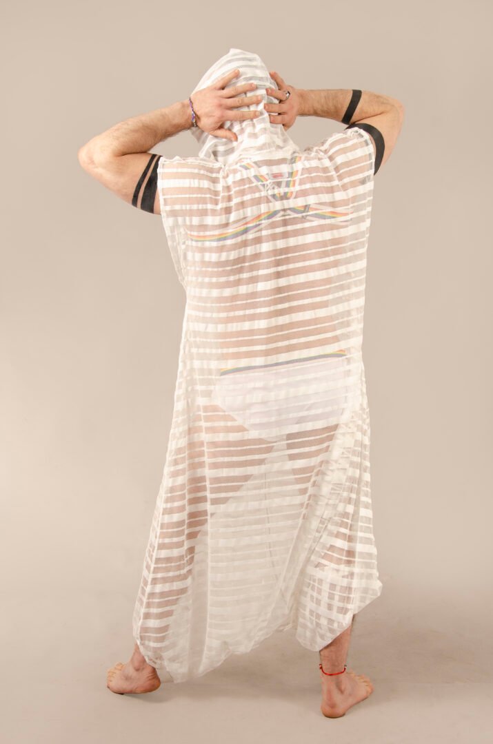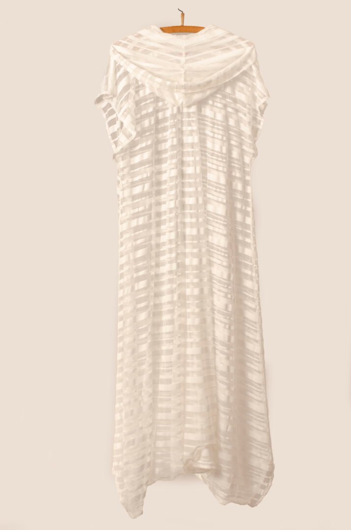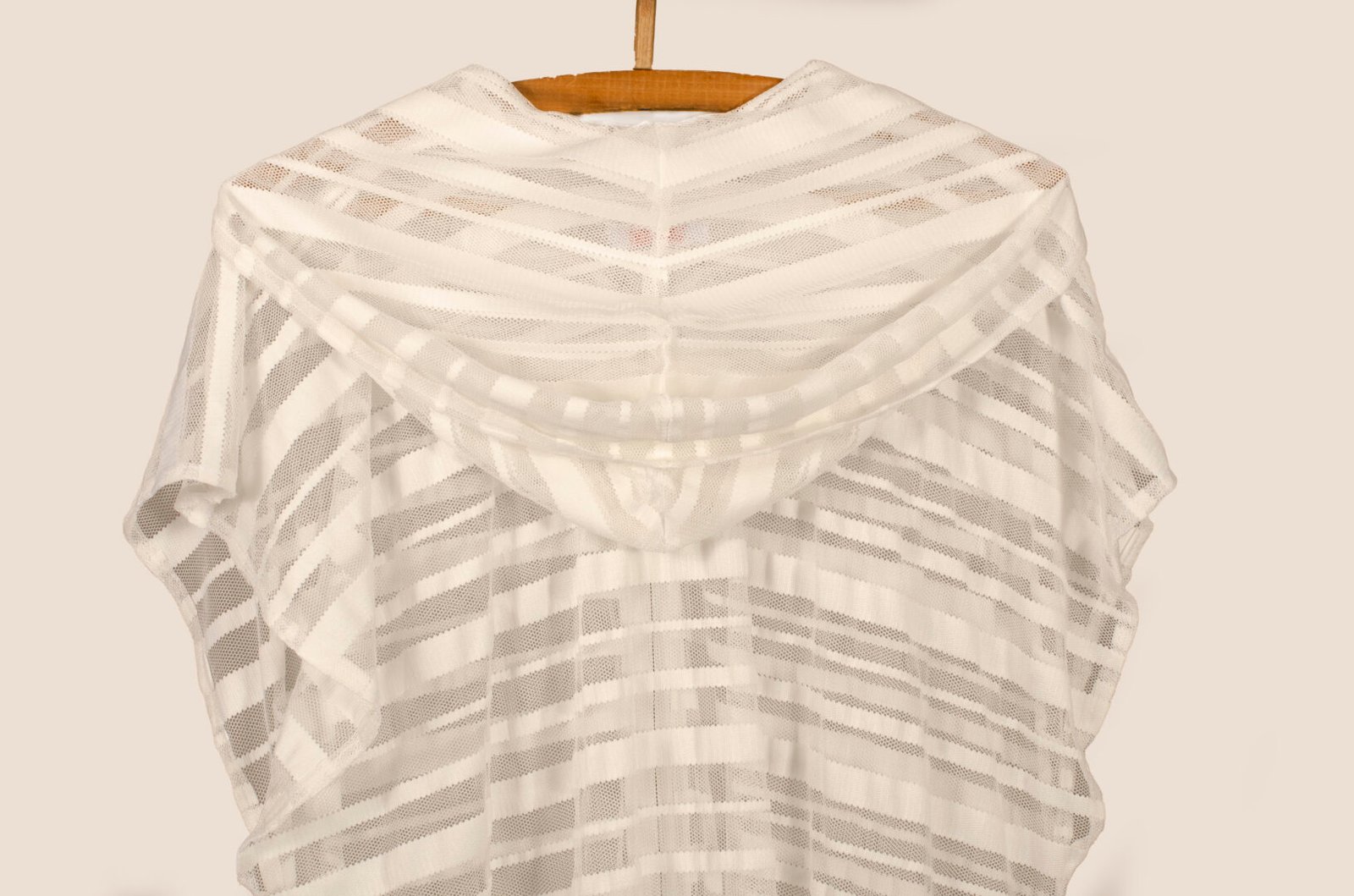 Crafted from Italian-origin white striped lace, this exceptional gender-neutral piece features an oversized hood, a stylish visible closure, and a matching belt for enhanced functionality. Its transparent fabric adds a very sexy touch, while its unisex design and unique size allow for an elegant and comfortable adaptation to all body types and occasions. Made in France, it embodies high-quality handmade craftsmanship, inspired by French Haute Couture, applied to ready-to-wear fashion.