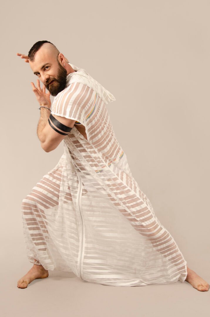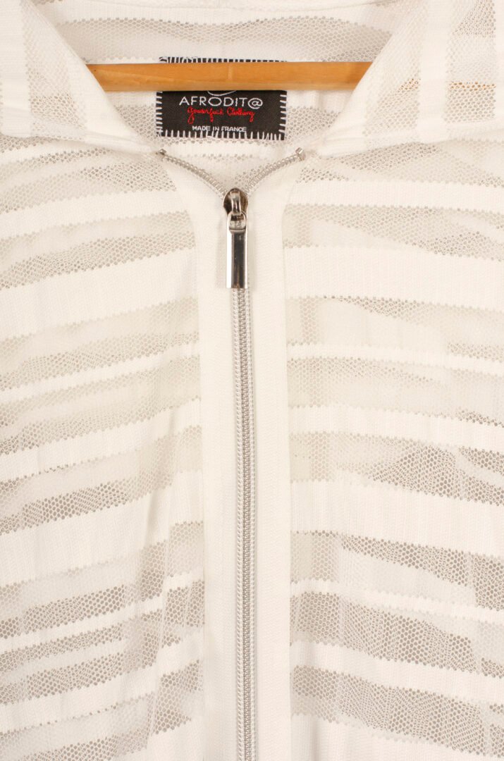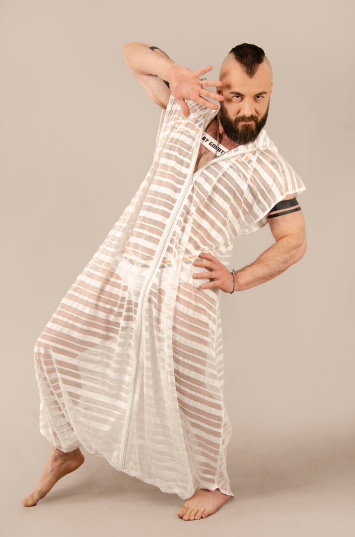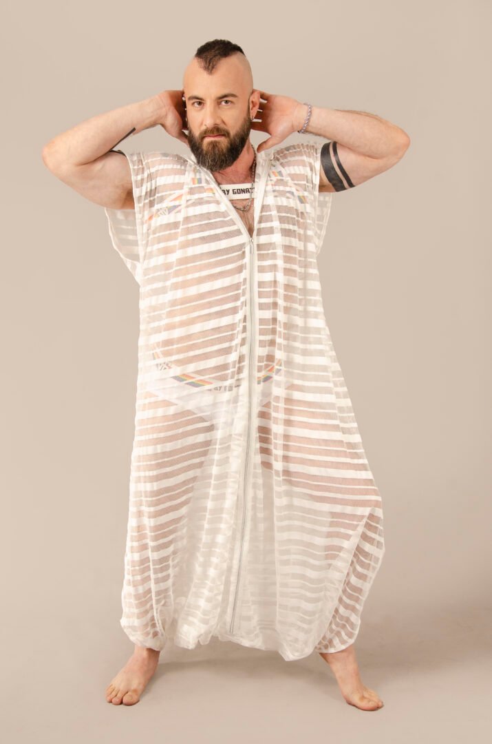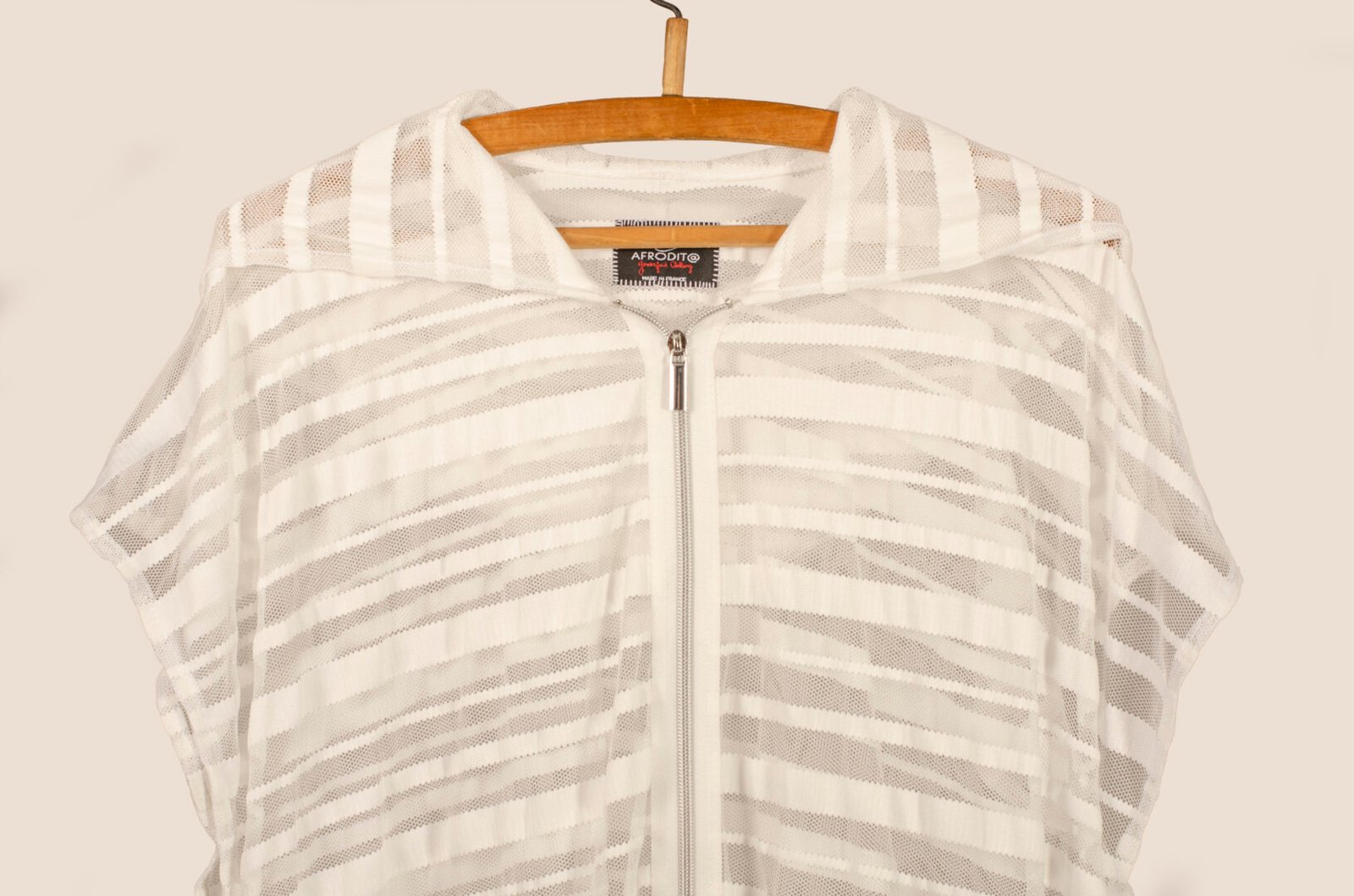 Crafted from Italian-origin white striped lace, this exceptional gender-neutral piece features an oversized hood, a stylish visible closure, and a matching belt for enhanced functionality. Its transparent fabric adds a very sexy touch, while its unisex design and unique size allow for an elegant and comfortable adaptation to all body types and occasions. Made in France, it embodies high-quality handmade craftsmanship, inspired by French Haute Couture, applied to ready-to-wear fashion.