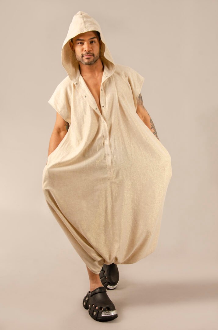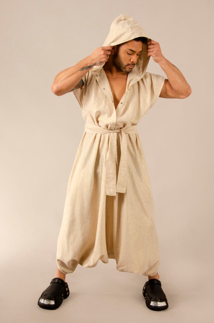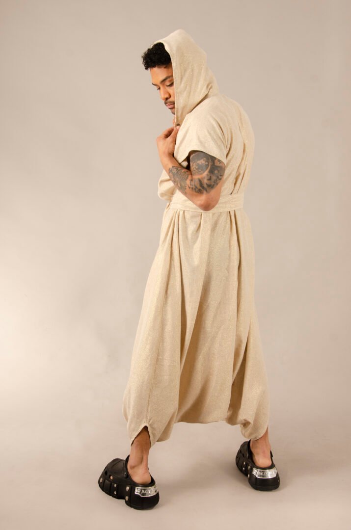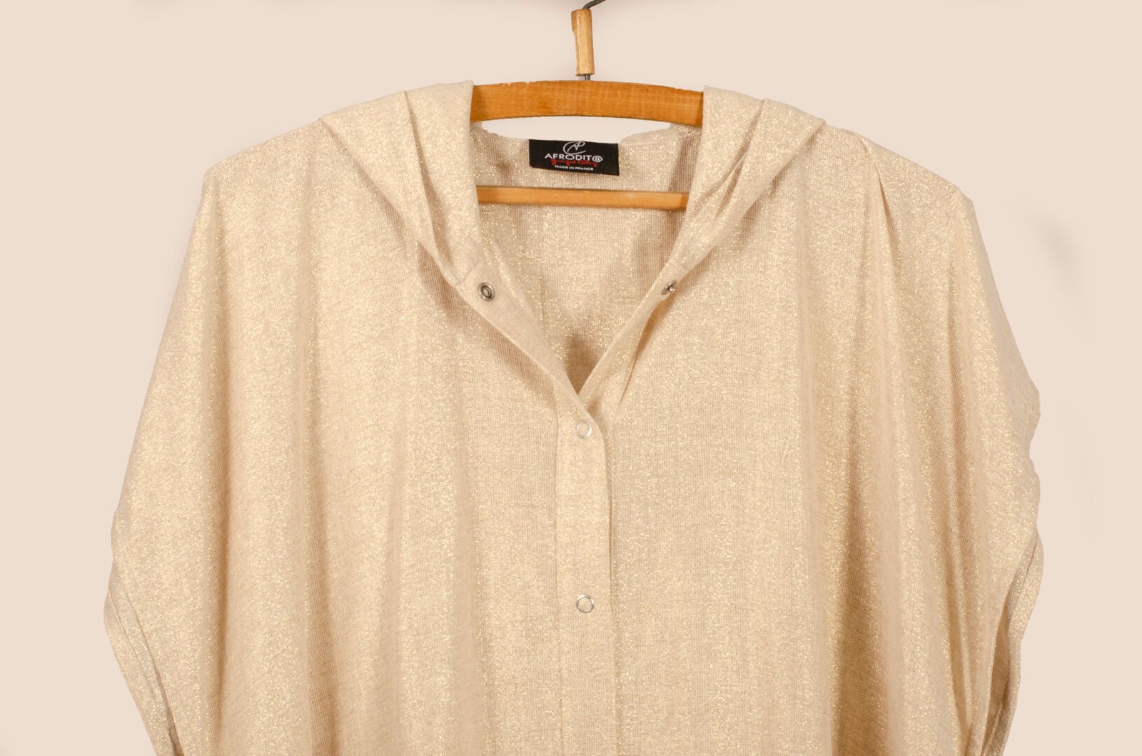 Crafted from Lurex, this exceptional gender-neutral piece features an oversized hood, stylish metallic snap buttons, and hidden side pockets for enhanced functionality. A matching belt completes the ensemble, allowing for an elegant and comfortable transformation to suit all body types and occasions. Gold-colored threads add a special shine, reflecting light spectacularly.