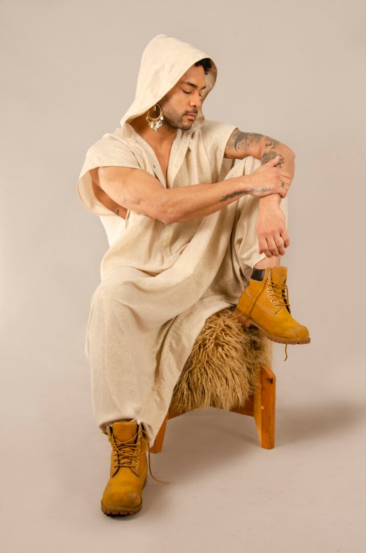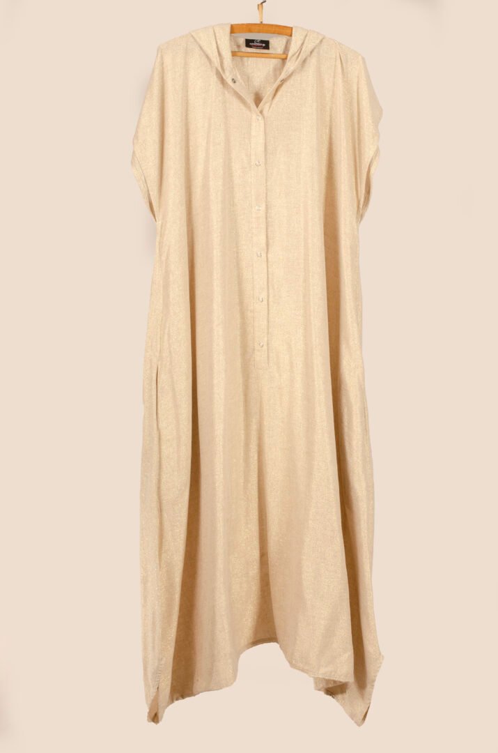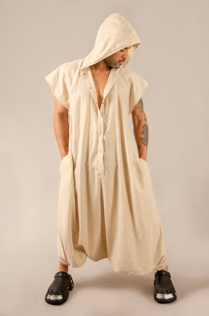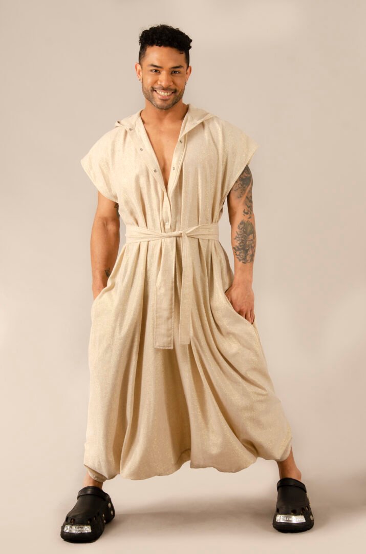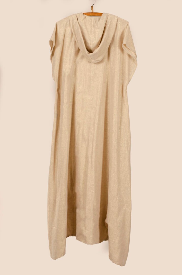 Crafted from Lurex, this exceptional gender-neutral piece features an oversized hood, stylish metallic snap buttons, and hidden side pockets for enhanced functionality. A matching belt completes the ensemble, allowing for an elegant and comfortable transformation to suit all body types and occasions. Gold-colored threads add a special shine, reflecting light spectacularly.