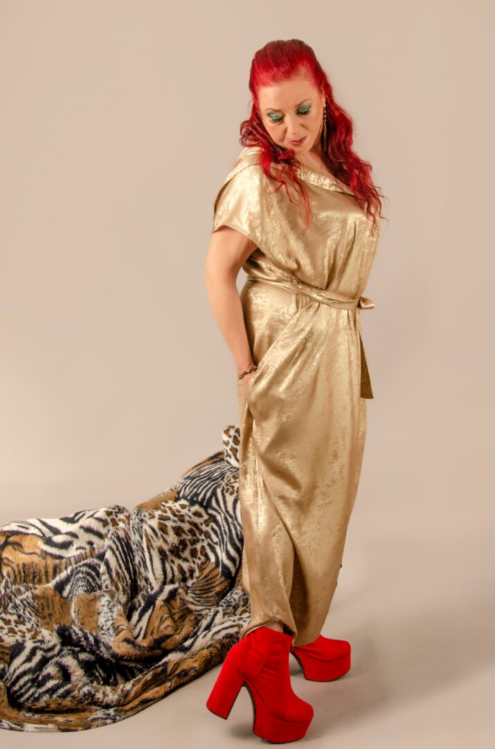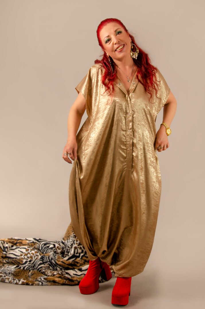 Crafted from 100% polyester, this exceptional gender-neutral piece features an oversized hood, stylish metallic snap buttons, and hidden side pockets for enhanced functionality. A matching belt completes the ensemble, allowing for an elegant and comfortable transformation to suit all body types and occasions. The metallic gold color, reminiscent of antique gold, adds a touch of glamour and sophistication.